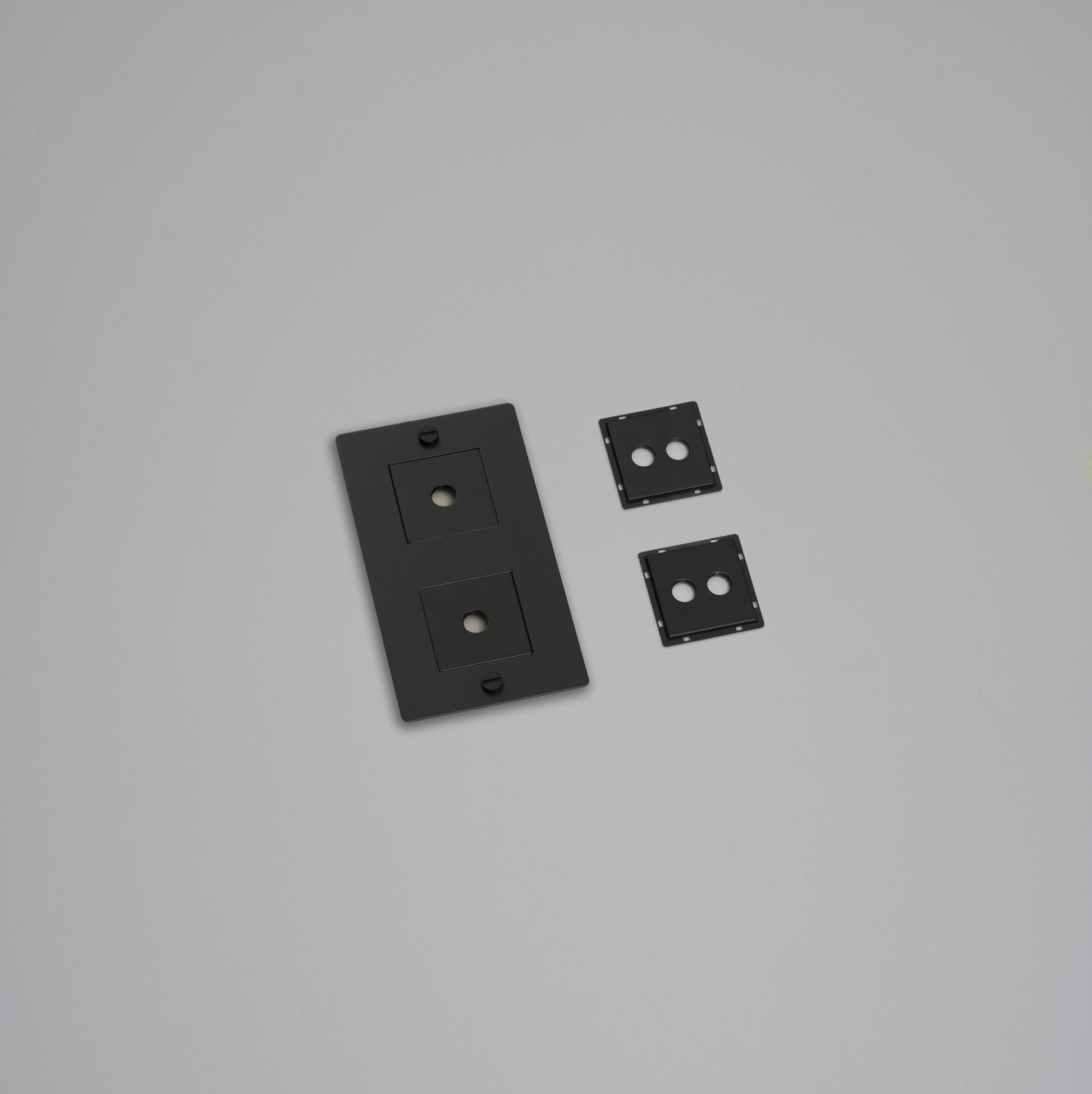 A 2G wall plate made from solid metal and finished with our signature solid metal coin screws. Comes with infills to fit a combination of toggles. dimmers. sockets and data modules.