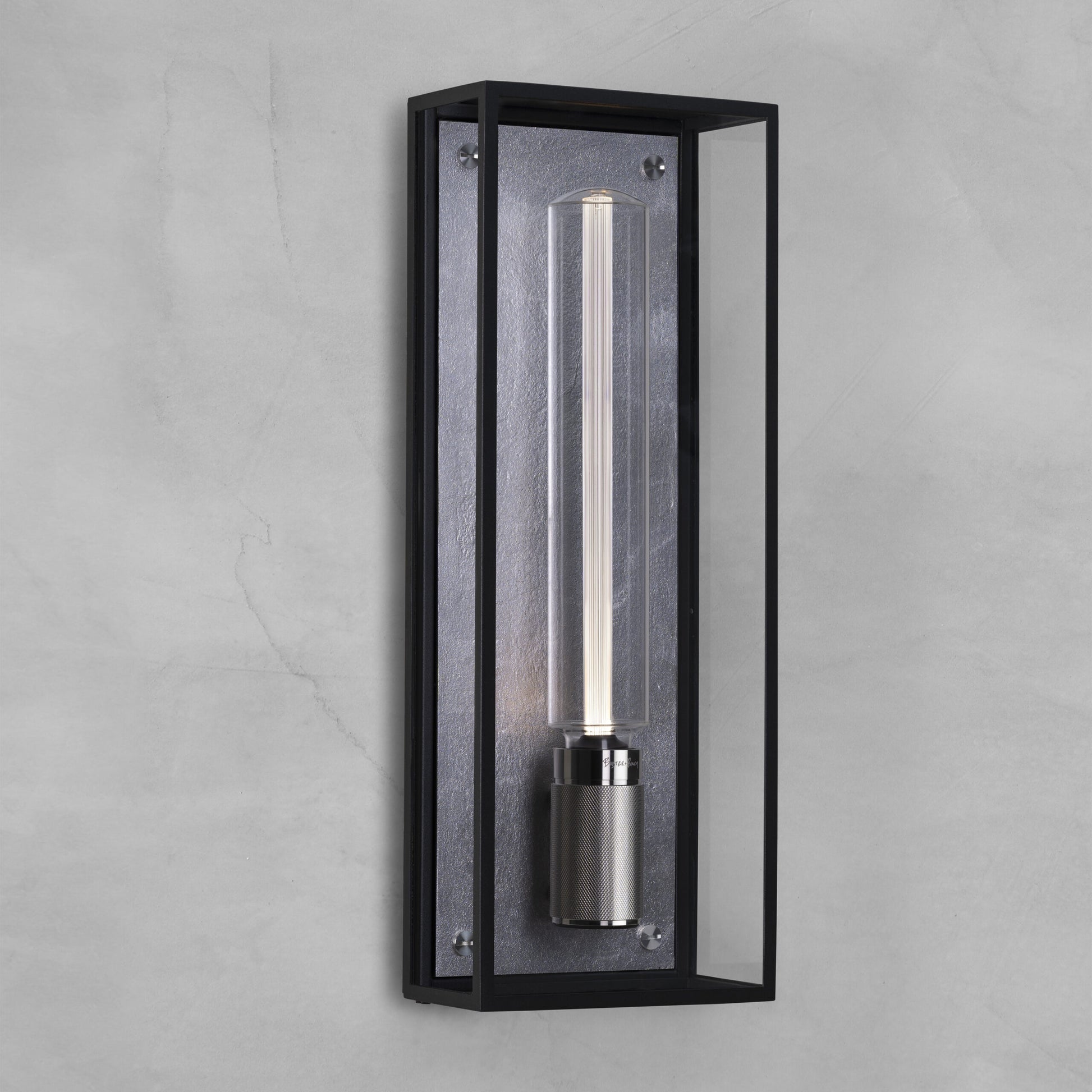 A wall light made from a matt black metal and glass cage, complete with a sand cast metal back panel. It features a solid metal, cross knurled, lampholder with our signature coin screws. IP44 rated and ADA compliant, suitable for wet locations*, bathroom and outside use. Available in Steel, Brass, Gun metal, Black + Steel, Black + Brass and Black + Gun Metal finishes.