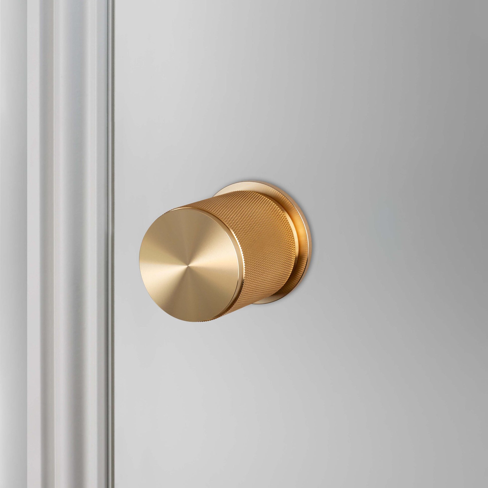 A door knob set made from solid brass. This door knob features our signature, diamond-cut, cross-knurl pattern and is refined by hand.