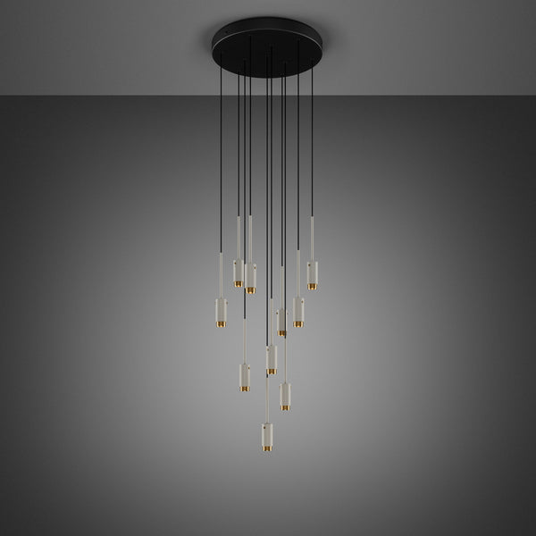 A bespoke CASCADE chandelier with either 19 or 31 light pendants made from solid metal and featuring our cross-knurl pattern. This chandelier features HEAVY METAL lights and is powered by exposed LED BUSTER bulbs to give a warm and ambient glow. Built custom to fit your space perfectly.