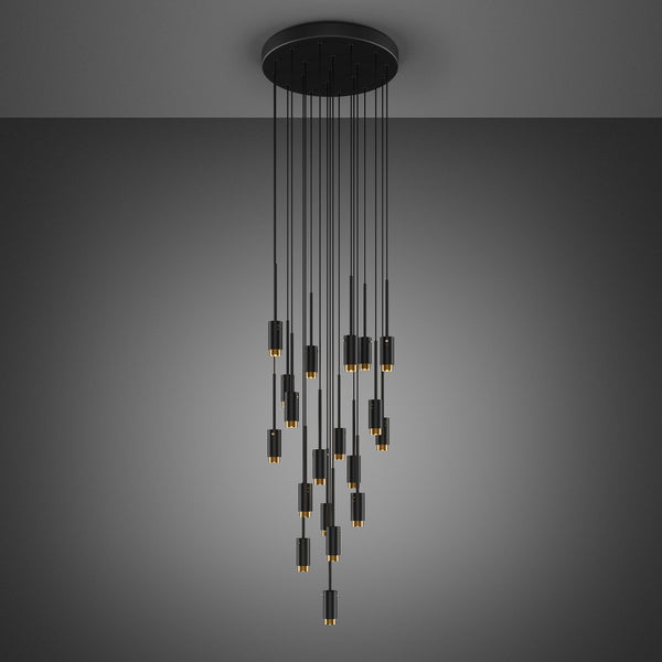 A bespoke CASCADE chandelier with either 19 or 31 light pendants made from solid metal and featuring our cross-knurl pattern. This chandelier features HEAVY METAL lights and is powered by exposed LED BUSTER bulbs to give a warm and ambient glow. Built custom to fit your space perfectly.