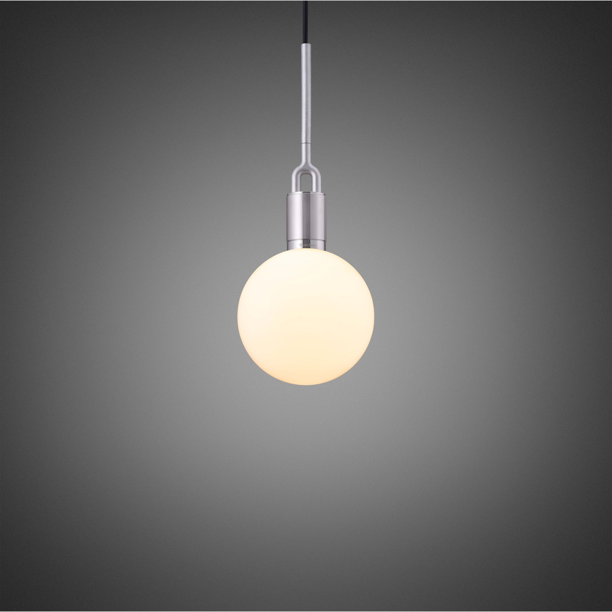 A light pendant. combining machined and cast solid metal. all refined by hand. It features our cast forked detailing and signature diamond-cut linear knurling. The light comes complete with a hand blown opal glass globe and Forked-specific dimmable Buster Bulb. casting a functional ambient light in this configuration.