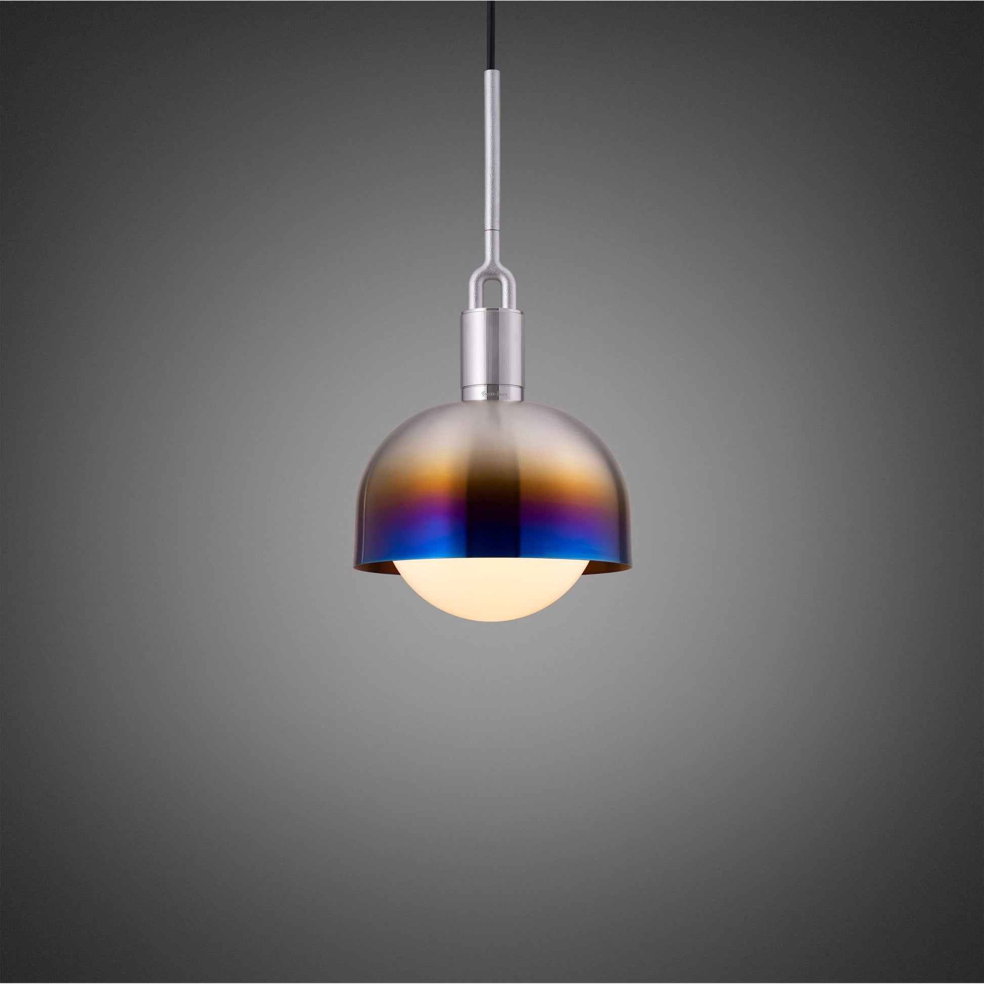 A light pendant and shade. combining machined. hand-spun and cast solid metal. all refined by hand. It features our cast forked detailing and signature diamond-cut linear knurling. The light comes complete with a hand blown opal glass globe and Forked-specific dimmable Buster Bulb. casting a functional ambient light in this configuration.
