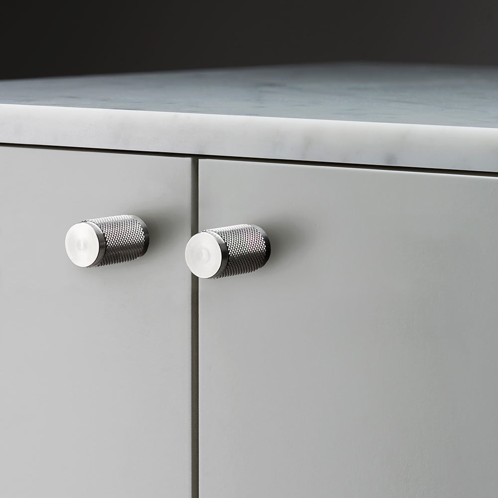 A pair of furniture knobs made from solid stainless steel. These knobs feature our signature, diamond-cut, cross-knurl pattern and are refined by hand.