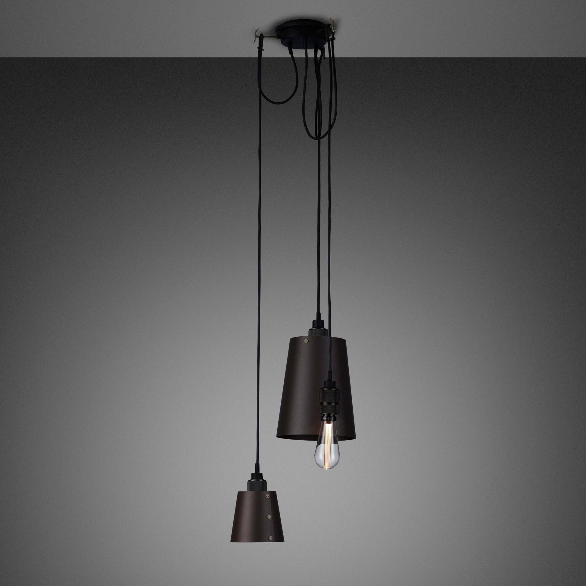 A chandelier made up of three light pendants. each with their own customising hook. and matte rubber detailing. This light is available with STEEL. BRASS or SMOKED BRONZE pendants.