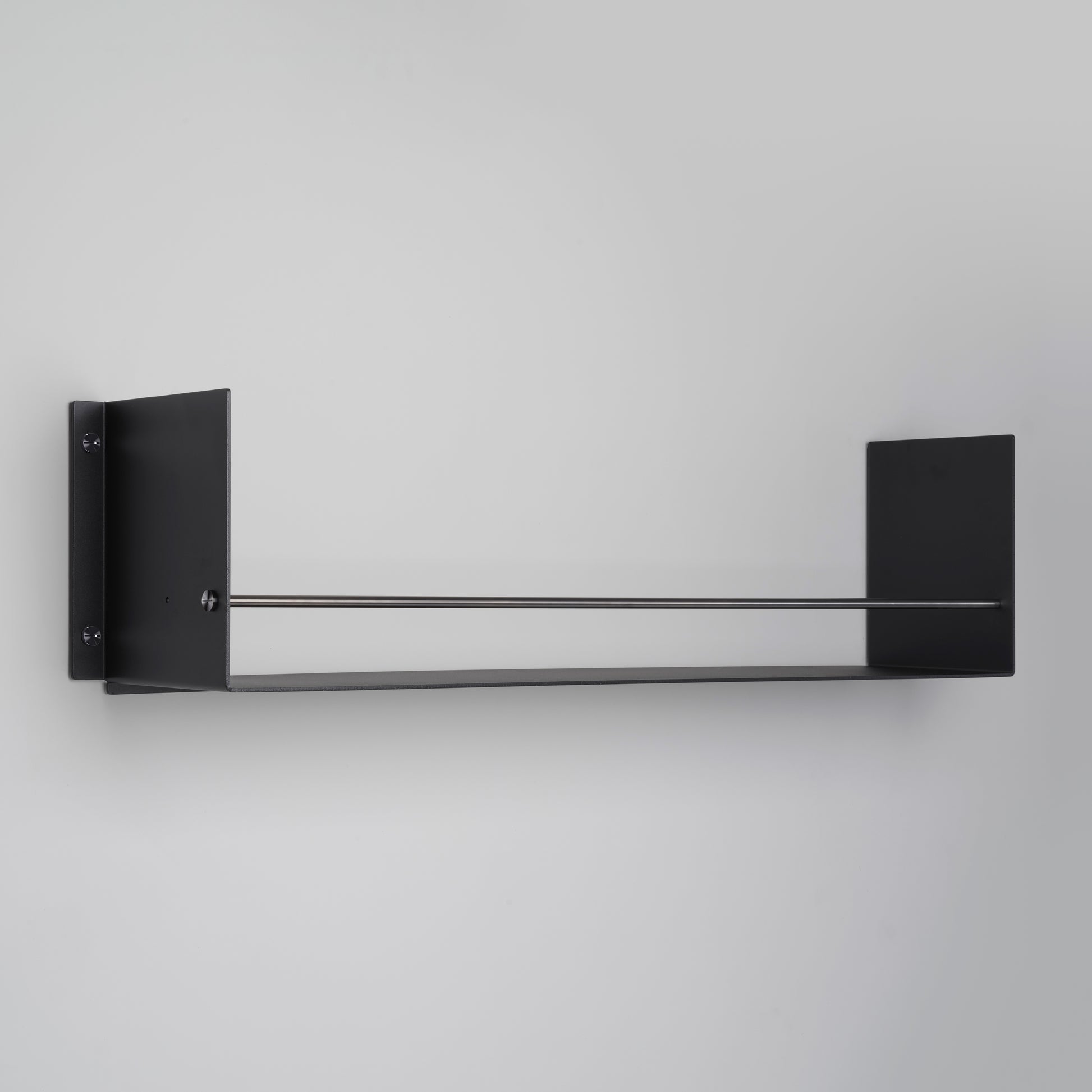 The heavy-duty shelf is made from laser cut 0.16” sheet aluminium, press bent and powder coated. To keep your belongings where they should be, it features a 0.5” hand polished solid metal guard rail, polished by hand and matching solid metal coin screws.