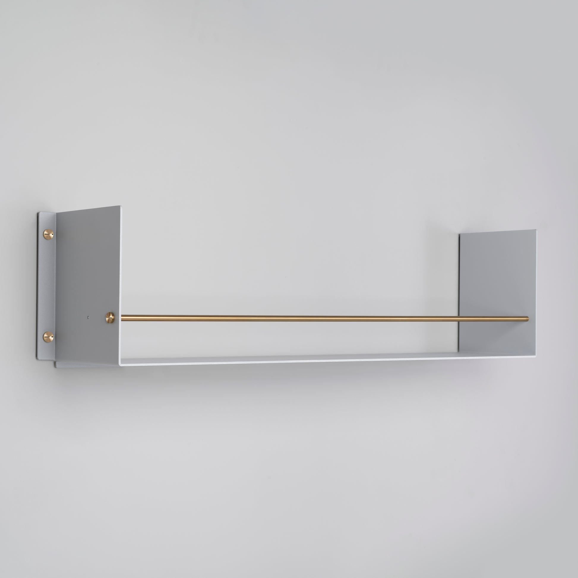 The heavy-duty shelf is made from laser cut 0.16” sheet aluminium, press bent and powder coated. To keep your belongings where they should be, it features a 0.5” hand polished solid metal guard rail, polished by hand and matching solid metal coin screws.