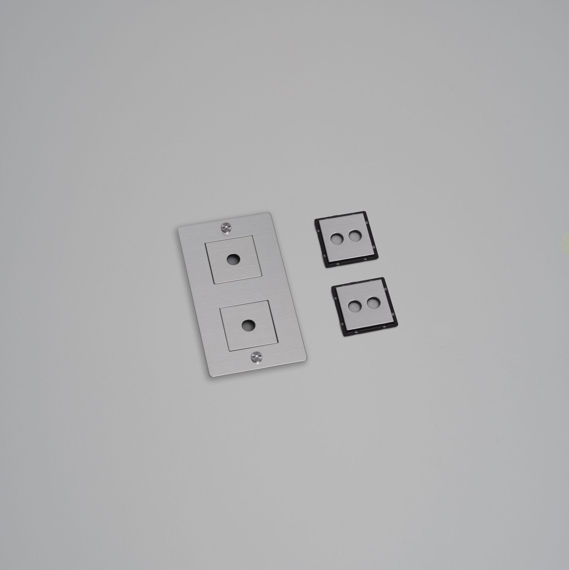 Eine 2G-Wandplatte aus massivem Metall, versehen mit unseren charakteristischen Münzschrauben aus massivem Metall. Wird mit Füllungen geliefert, die zu einer Kombination von Kipphebeln passen. Dimmer. Steckdosen und Datenmodule.