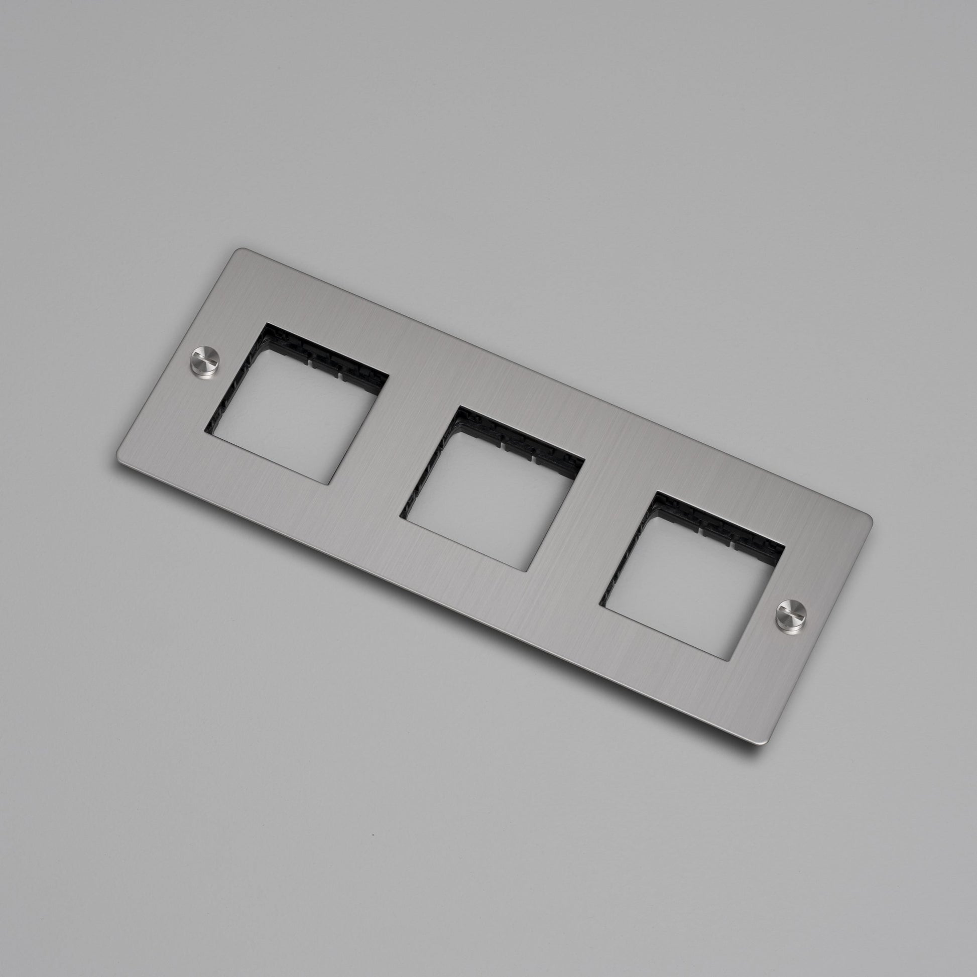 Eine horizontale 3G-Wandplatte aus massivem Metall, versehen mit unseren charakteristischen Münzschrauben aus massivem Metall. Keine Füllungen enthalten. Auf dieser Platte können nur Steckdosen und Datenmodule montiert werden.