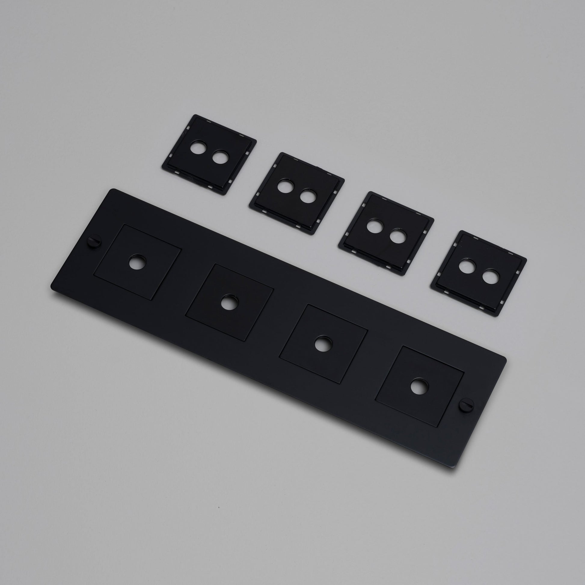 Eine 4G-Wandplatte aus massivem Metall, versehen mit unseren charakteristischen Münzschrauben aus massivem Metall. Wird mit Füllungen geliefert, die zu einer Kombination von Kipphebeln passen. Dimmer. Steckdosen und Datenmodule.