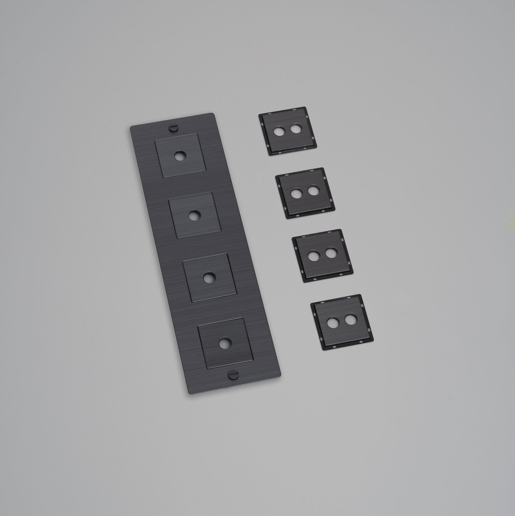 Eine 4G-Wandplatte aus massivem Metall, versehen mit unseren charakteristischen Münzschrauben aus massivem Metall. Wird mit Füllungen geliefert, die zu einer Kombination von Kipphebeln passen. Dimmer. Steckdosen und Datenmodule.