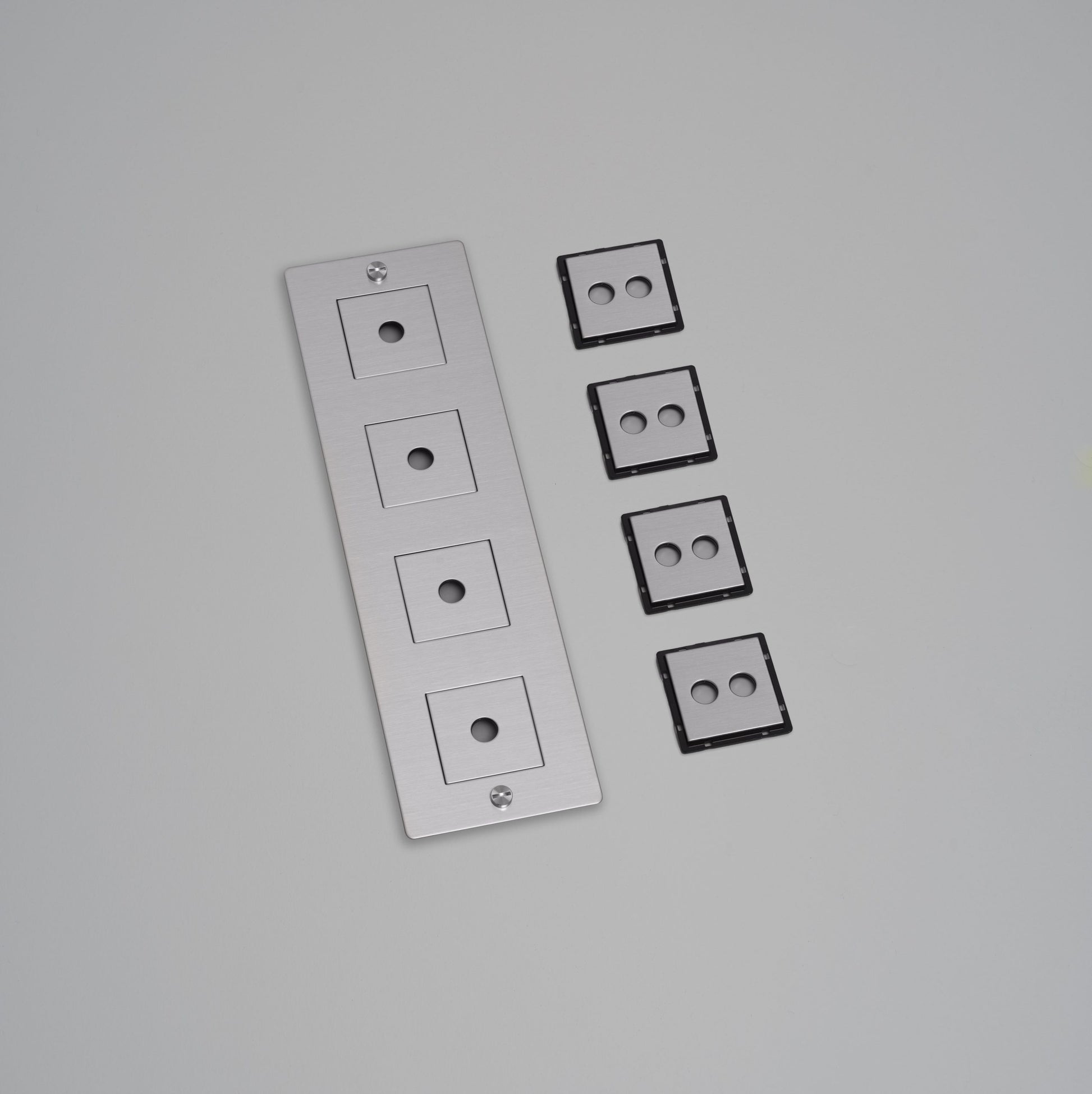 Eine 4G-Wandplatte aus massivem Metall, versehen mit unseren charakteristischen Münzschrauben aus massivem Metall. Wird mit Füllungen geliefert, die zu einer Kombination von Kipphebeln passen. Dimmer. Steckdosen und Datenmodule.
