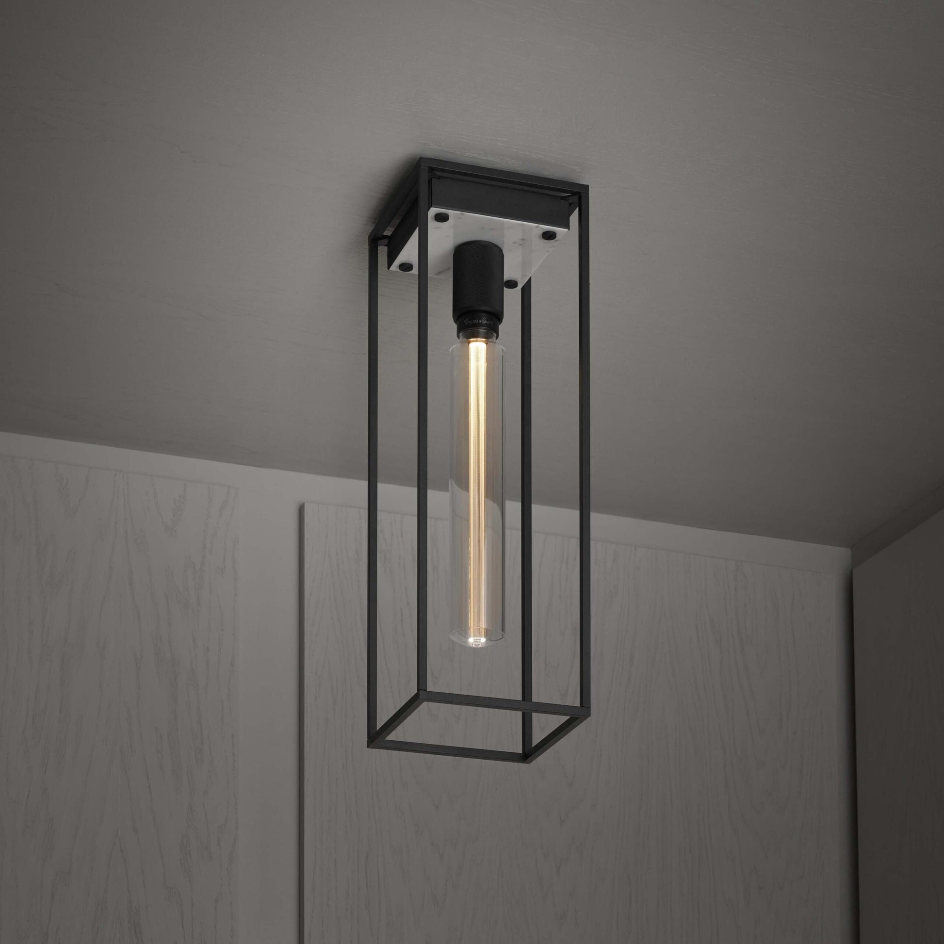 Eine Deckenleuchte aus einem mattschwarzen Metallkäfig mit einer polierten Rückwand aus WEISSEM MARMOR.