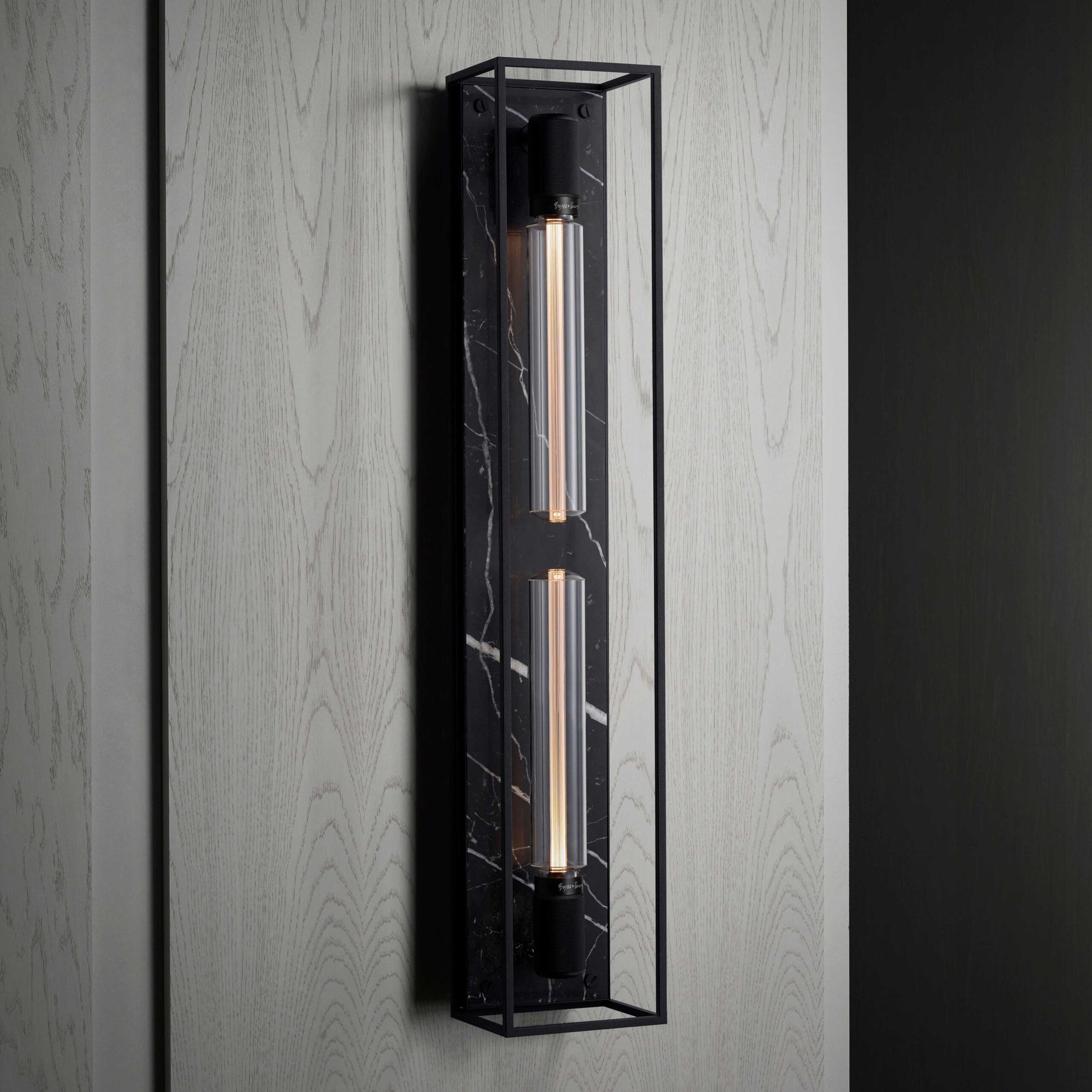 Eine Wandleuchte aus einem mattschwarzen Metallkäfig mit einer Rückwand aus poliertem schwarzem Marmor.