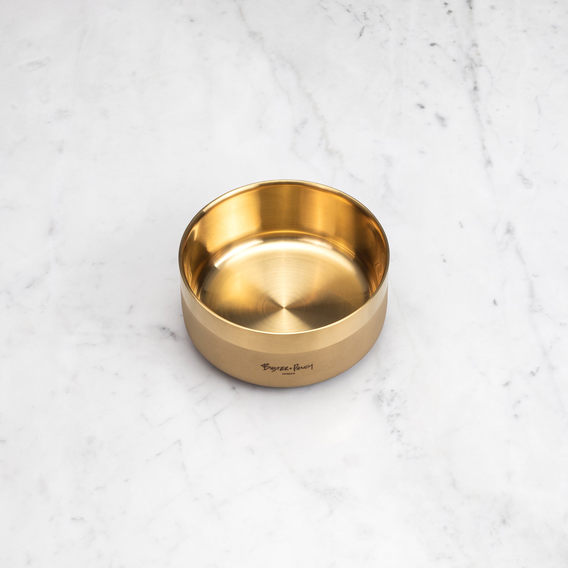 Ein Hundenapf aus gepresstem Edelstahl, aus Messing mit gebürsteter und sandgestrahlter Oberfläche, mit einem dezenten, geprägten B+P-Logo. Ein Silikonpuffer an der Unterseite verhindert ein Verrutschen.