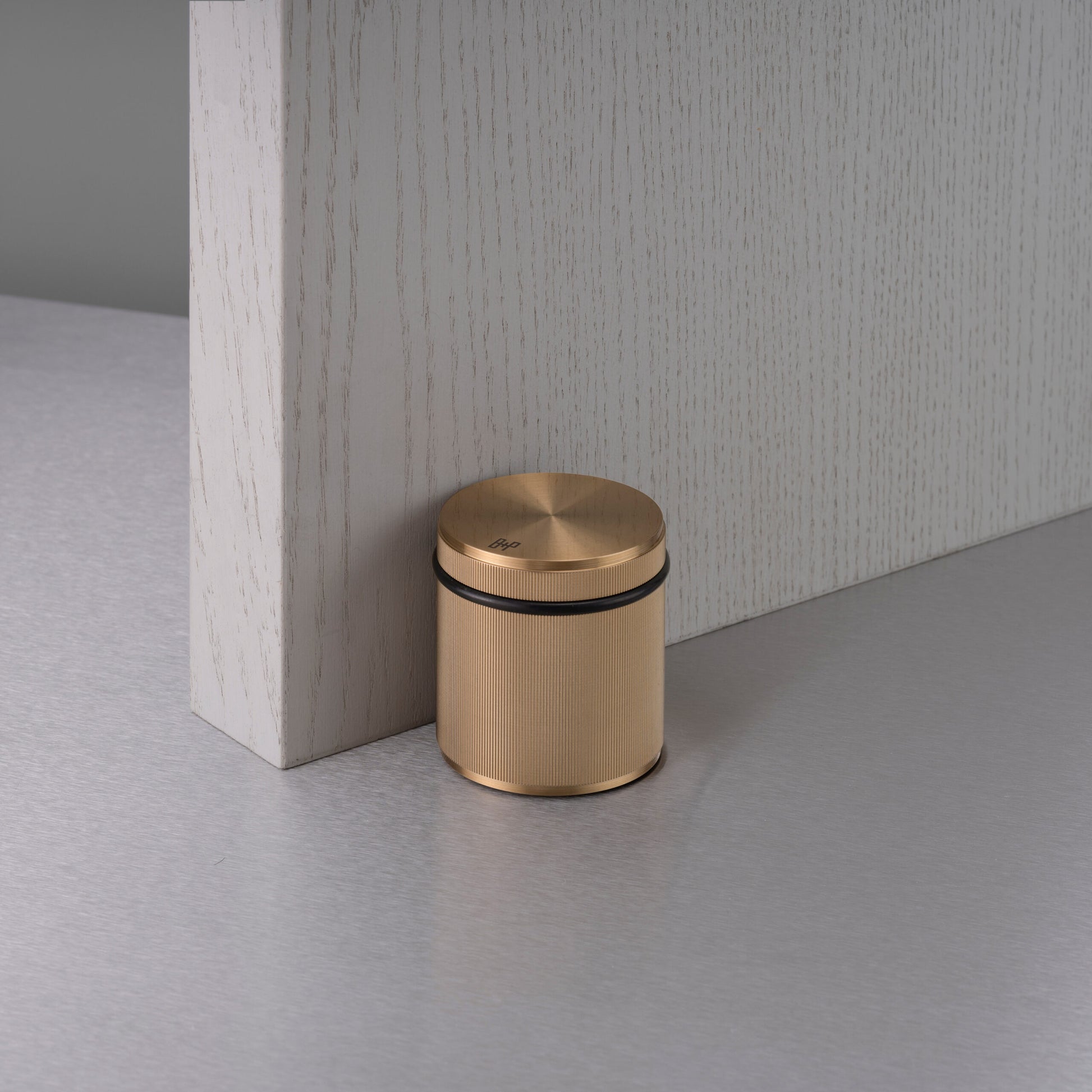 Ein freistehender Türstopper aus massivem Edelstahl mit Messing-EPL-Finish, unserem charakteristischen linearen Rändelmuster im Diamantschliff und Gummipuffern. Signiert mit einem geprägten B+P-Insignien und von Hand veredelt. Platzieren Sie es, wo immer Sie möchten, und positionieren Sie es nach Bedarf neu.
