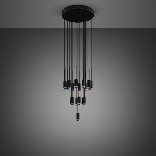 „Ein maßgeschneiderter CLASSIC-Kronleuchter mit entweder 10, 19 oder 31 Leuchtenanhängern aus massivem Metall und unserem linearen Rändelmuster. Dieser Kronleuchter verfügt über EXHAUST-Leuchten und wird von freiliegenden LED-EXHAUST-Glühbirnen angetrieben, um ein gerichtetes, diffuses Licht zu erzeugen. Maßgeschneidert, um zu passen Ihren Raum perfekt.