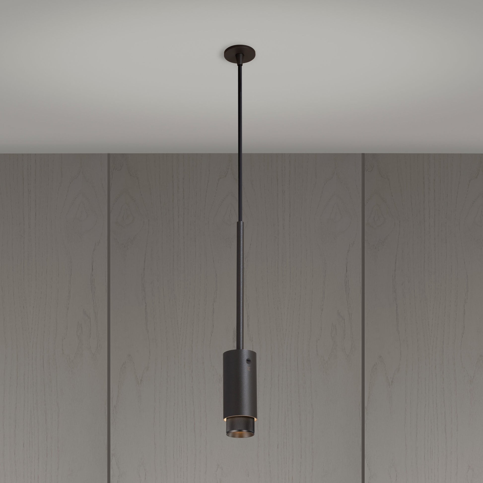 Ein Pendelstrahler aus graphitpulverbeschichtetem Metall mit massiven Stahldetails.