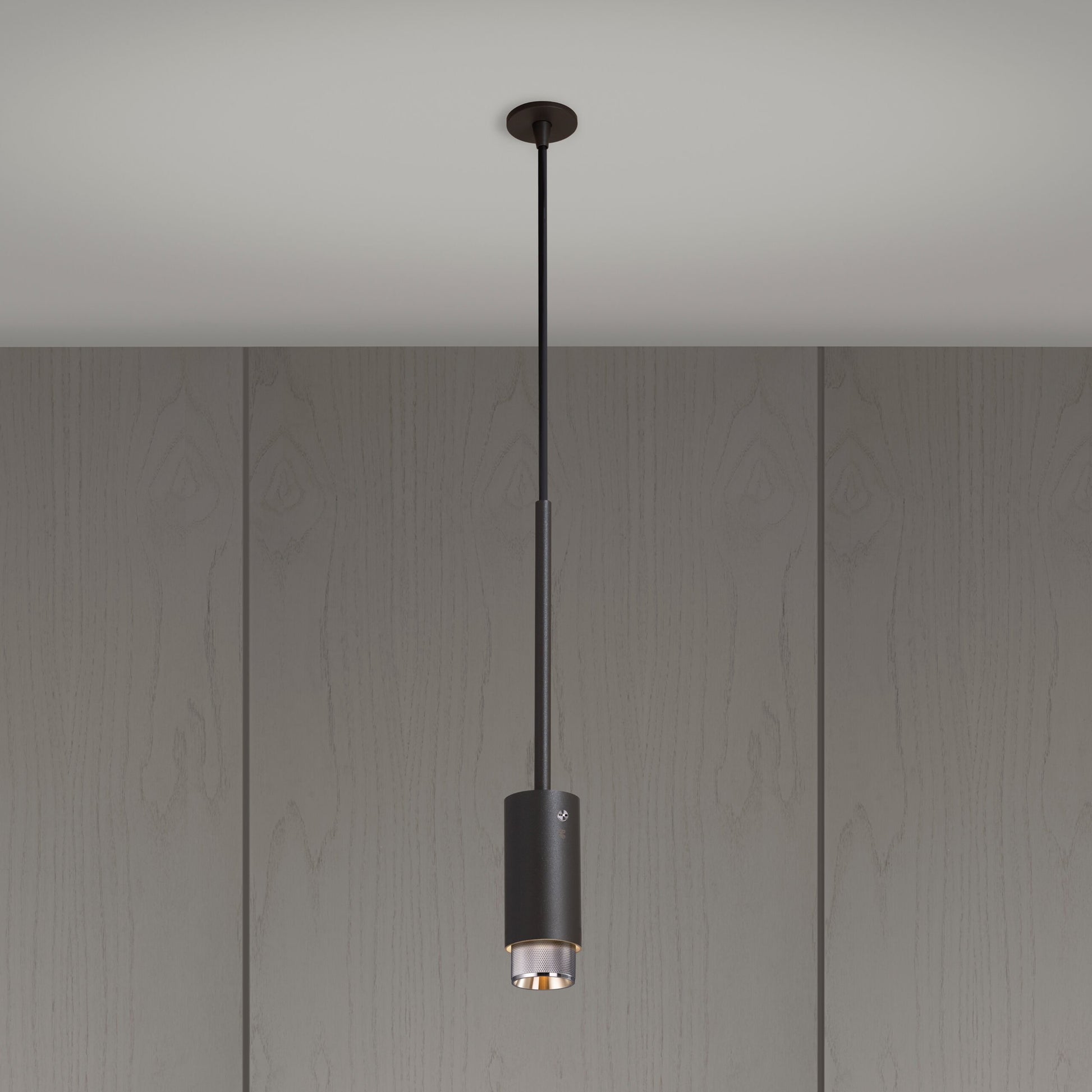 Ein Pendelstrahler aus graphitpulverbeschichtetem Metall mit massiven Stahldetails.