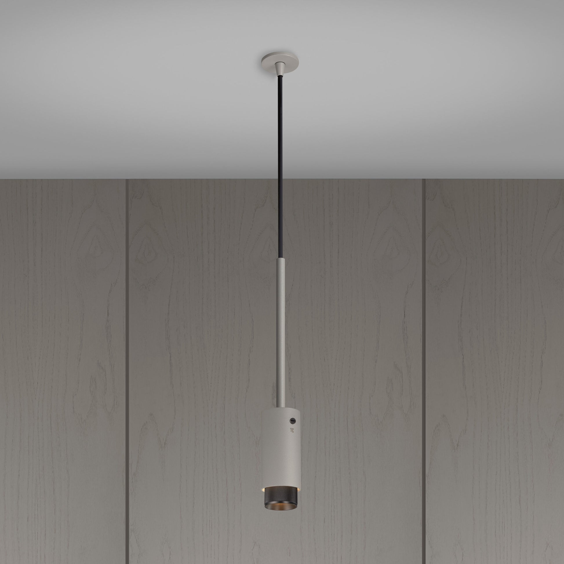 Ein Pendelstrahler aus steinpulverbeschichtetem Metall mit massiven Stahldetails.