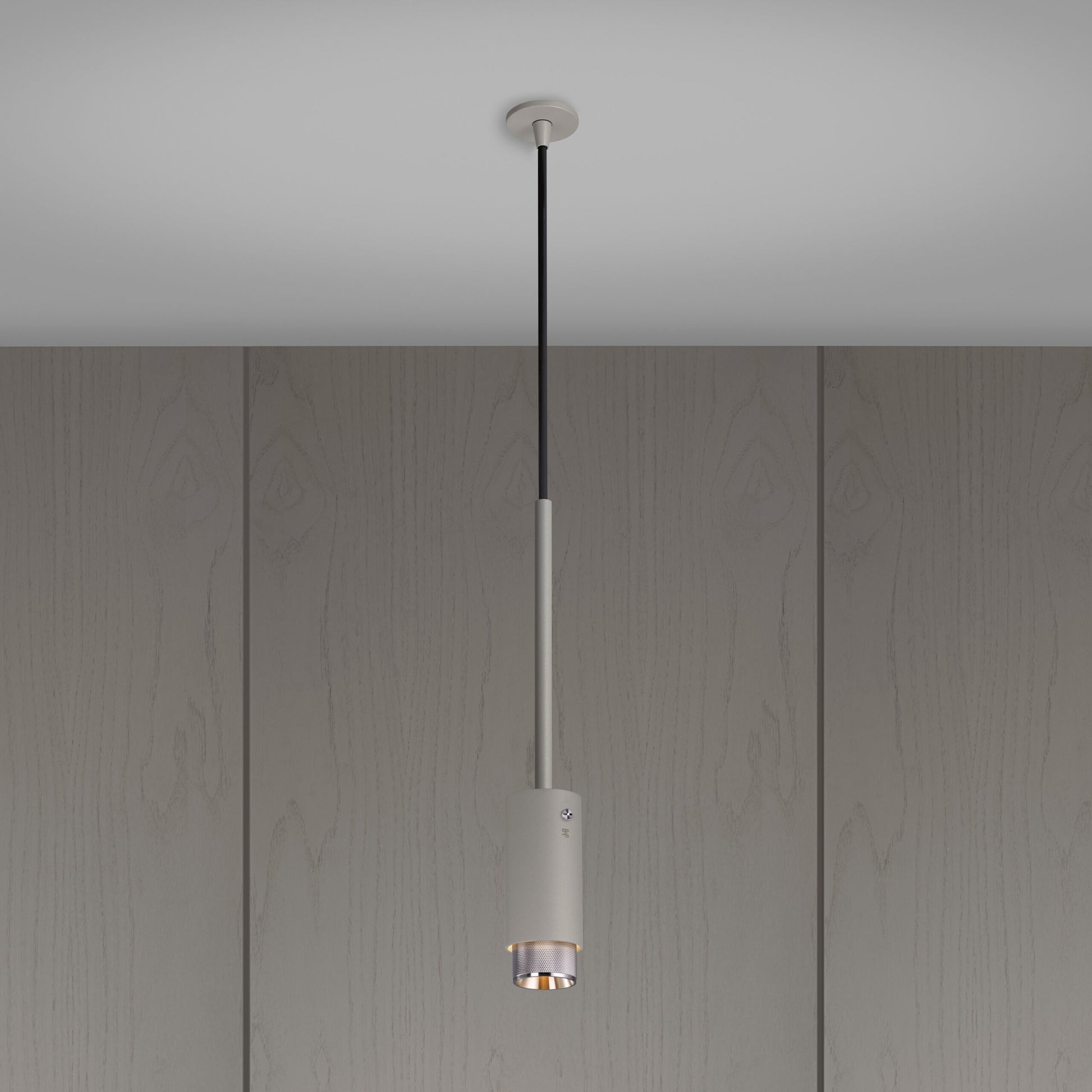 Ein Pendelstrahler aus steinpulverbeschichtetem Metall mit massiven Stahldetails.