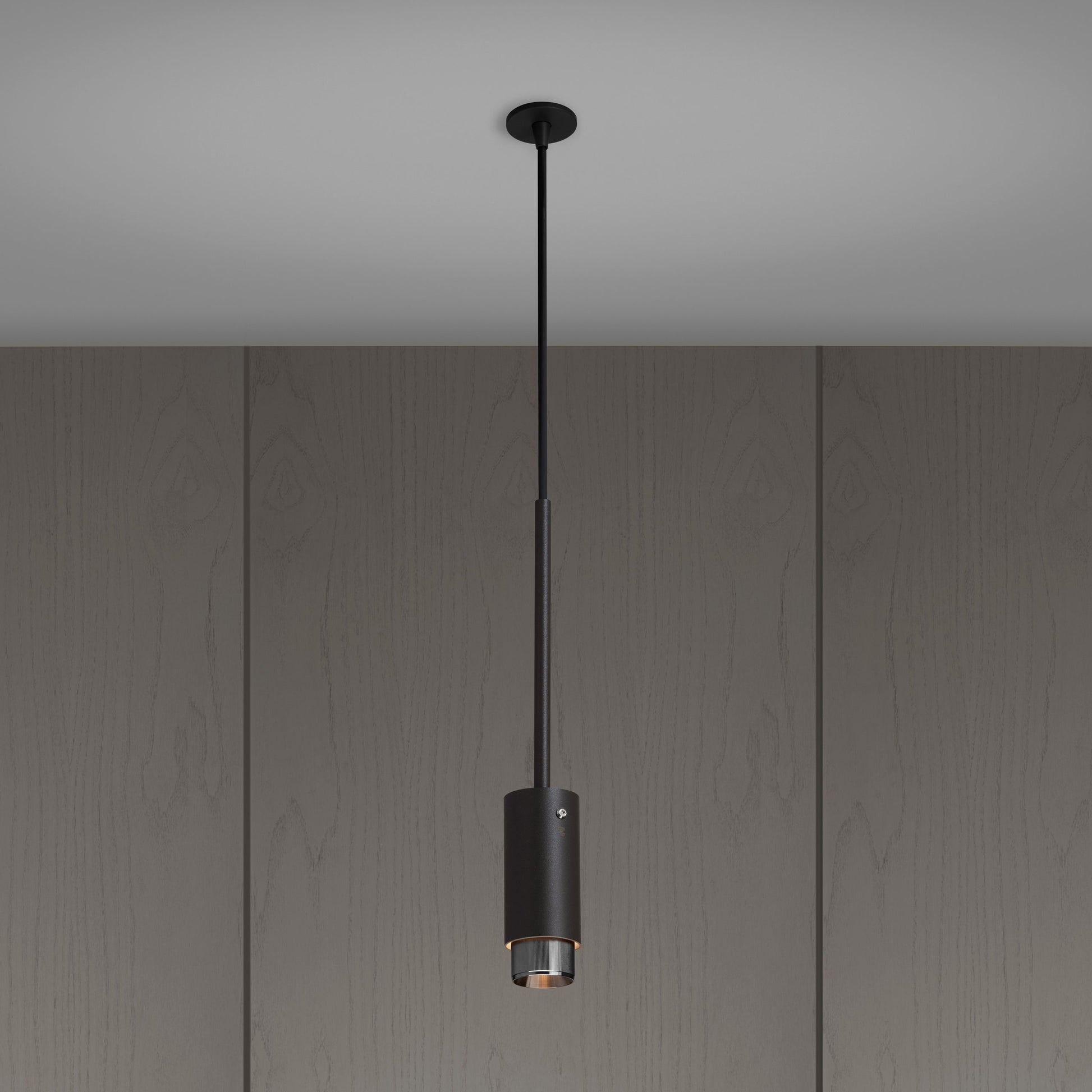 Ein Pendelstrahler aus graphitpulverbeschichtetem Metall mit massiven Stahldetails.