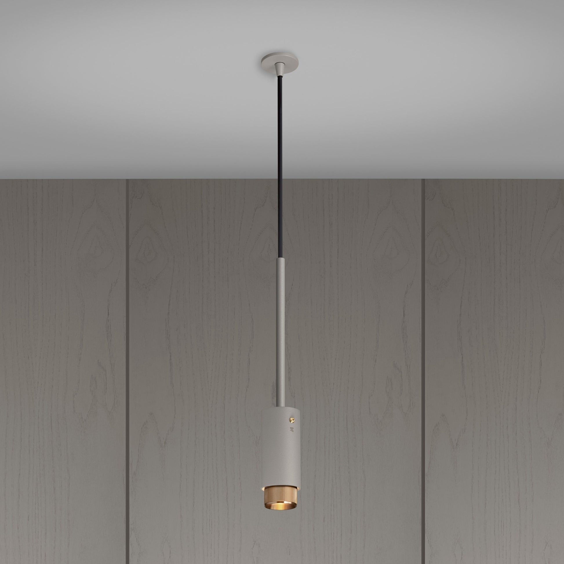 Ein Pendelstrahler aus steinpulverbeschichtetem Metall mit massiven Messingdetails.