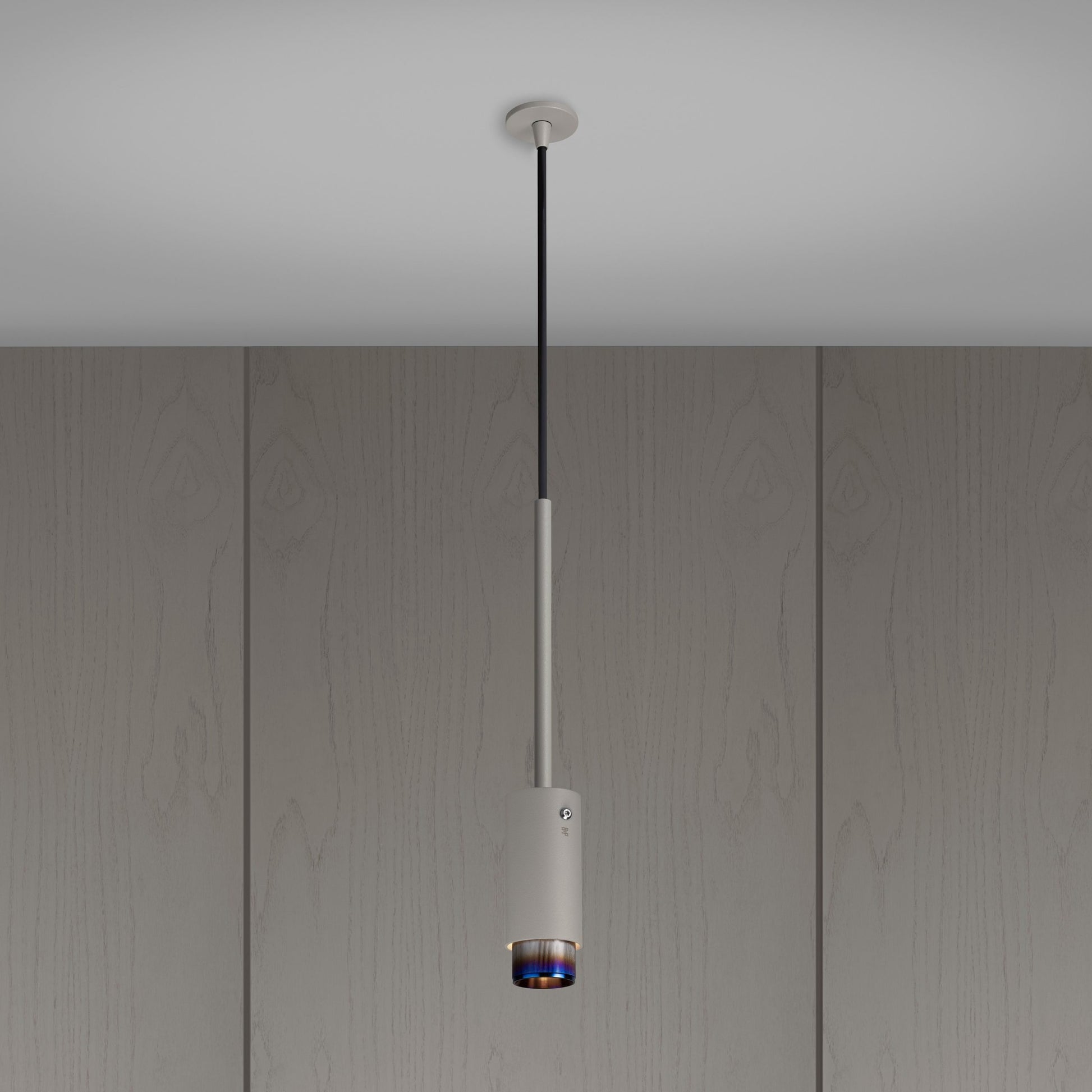Ein Pendelstrahler aus steinpulverbeschichtetem Metall mit massiven Stahldetails.