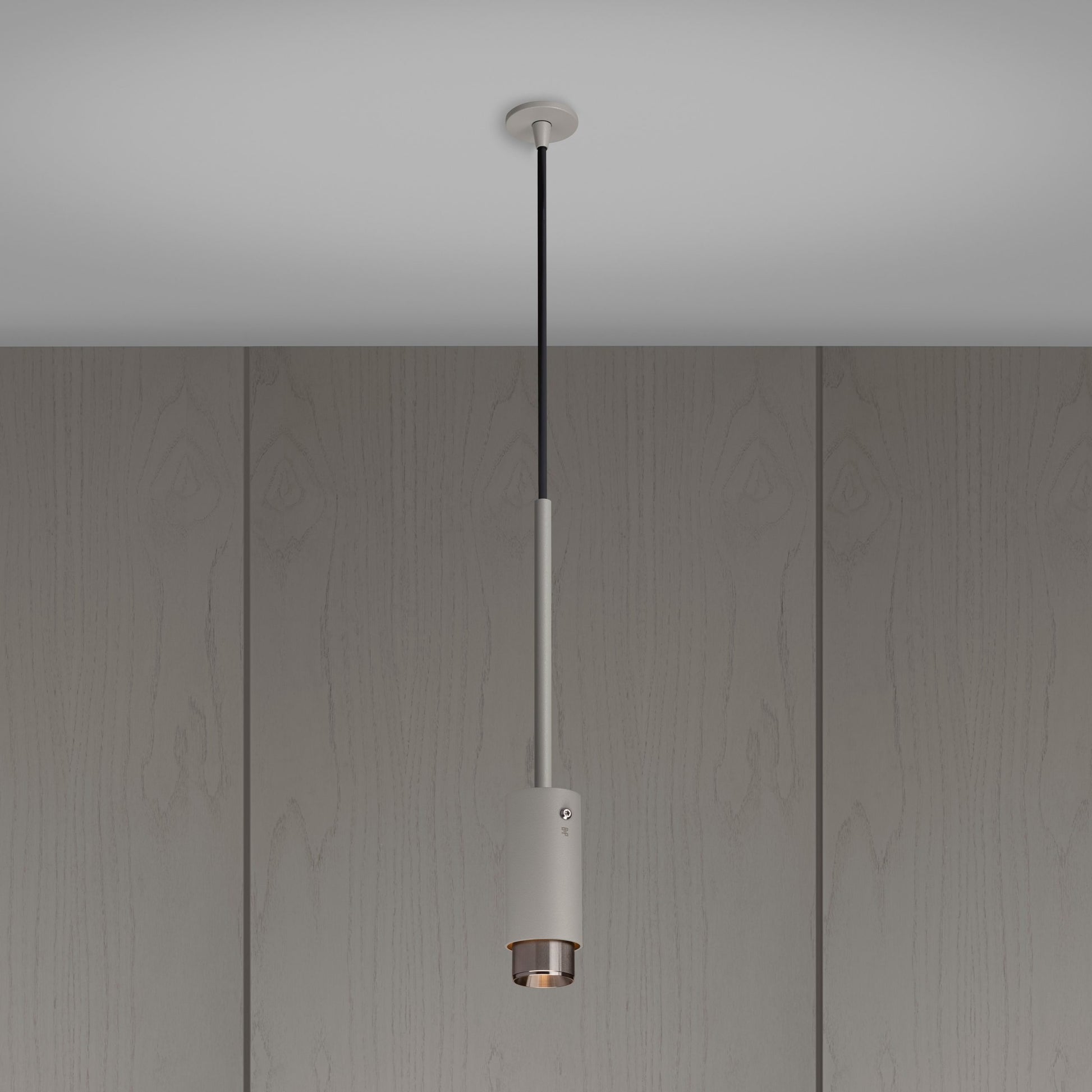Ein Pendelstrahler aus steinpulverbeschichtetem Metall mit massiven Stahldetails.