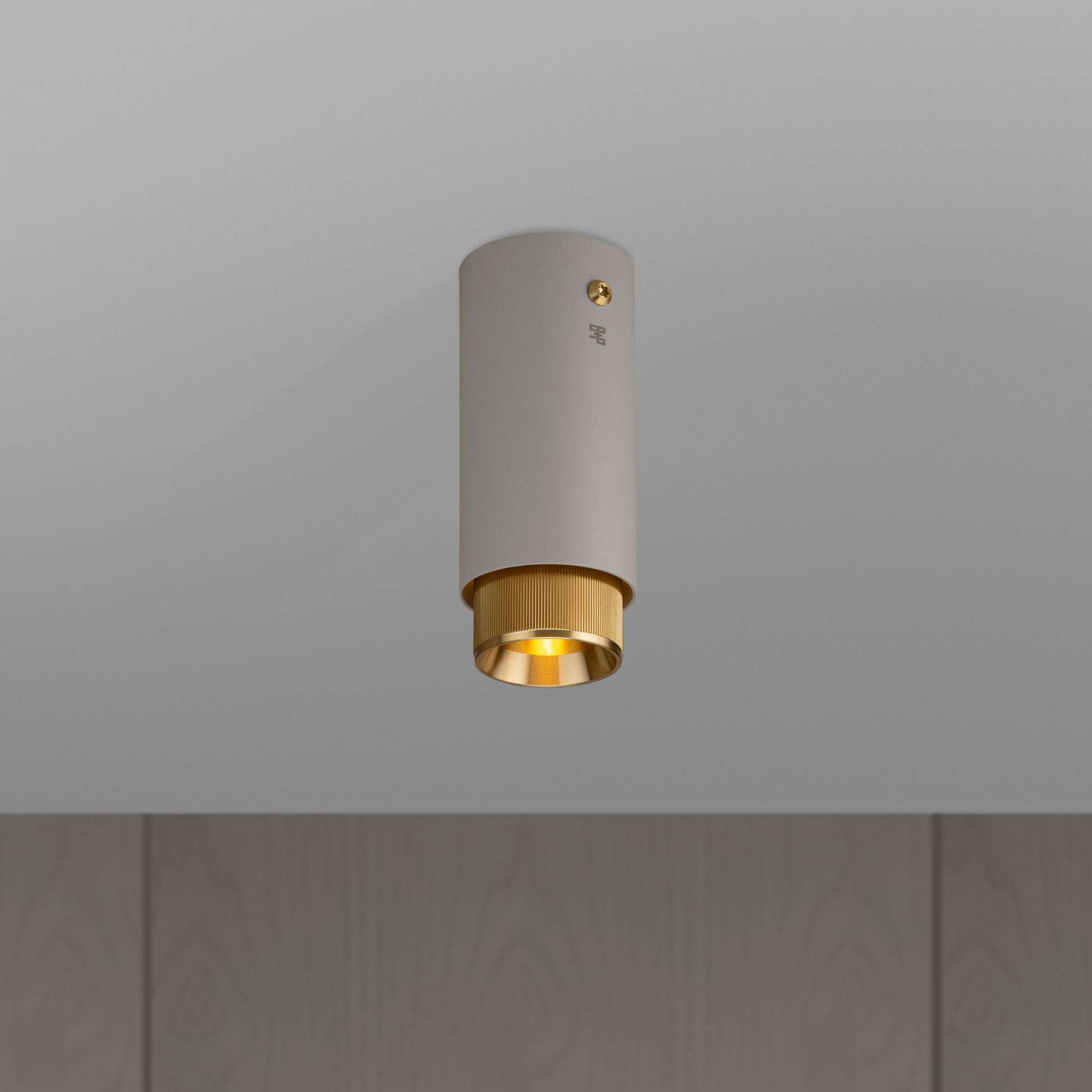 Eine Aufputzmontage. Fester Strahler aus steinpulverbeschichtetem Metall mit Details aus massivem Messing.