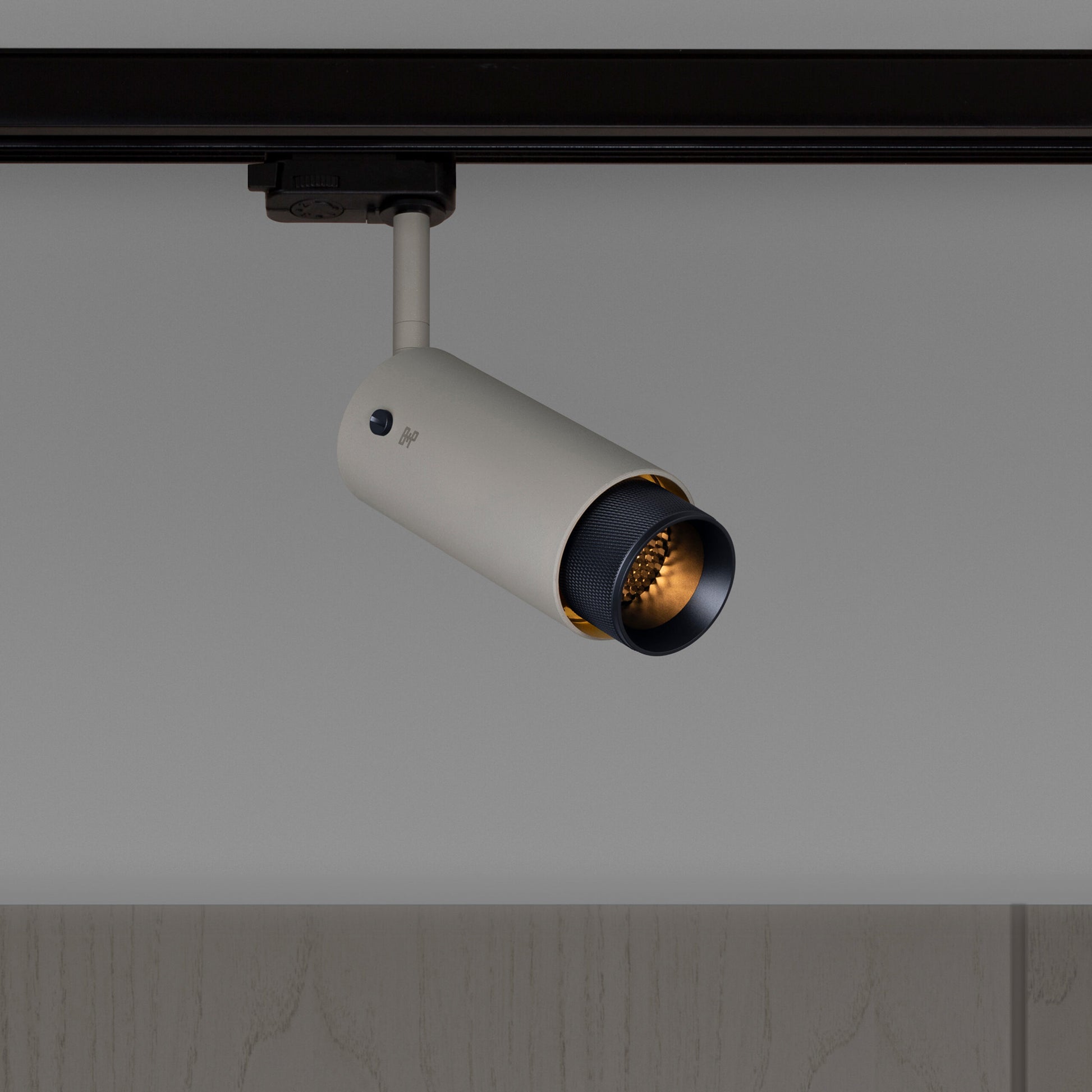 Ein Schienenstrahler aus steinpulverbeschichtetem Metall mit massiven Gun-Metal-Details.