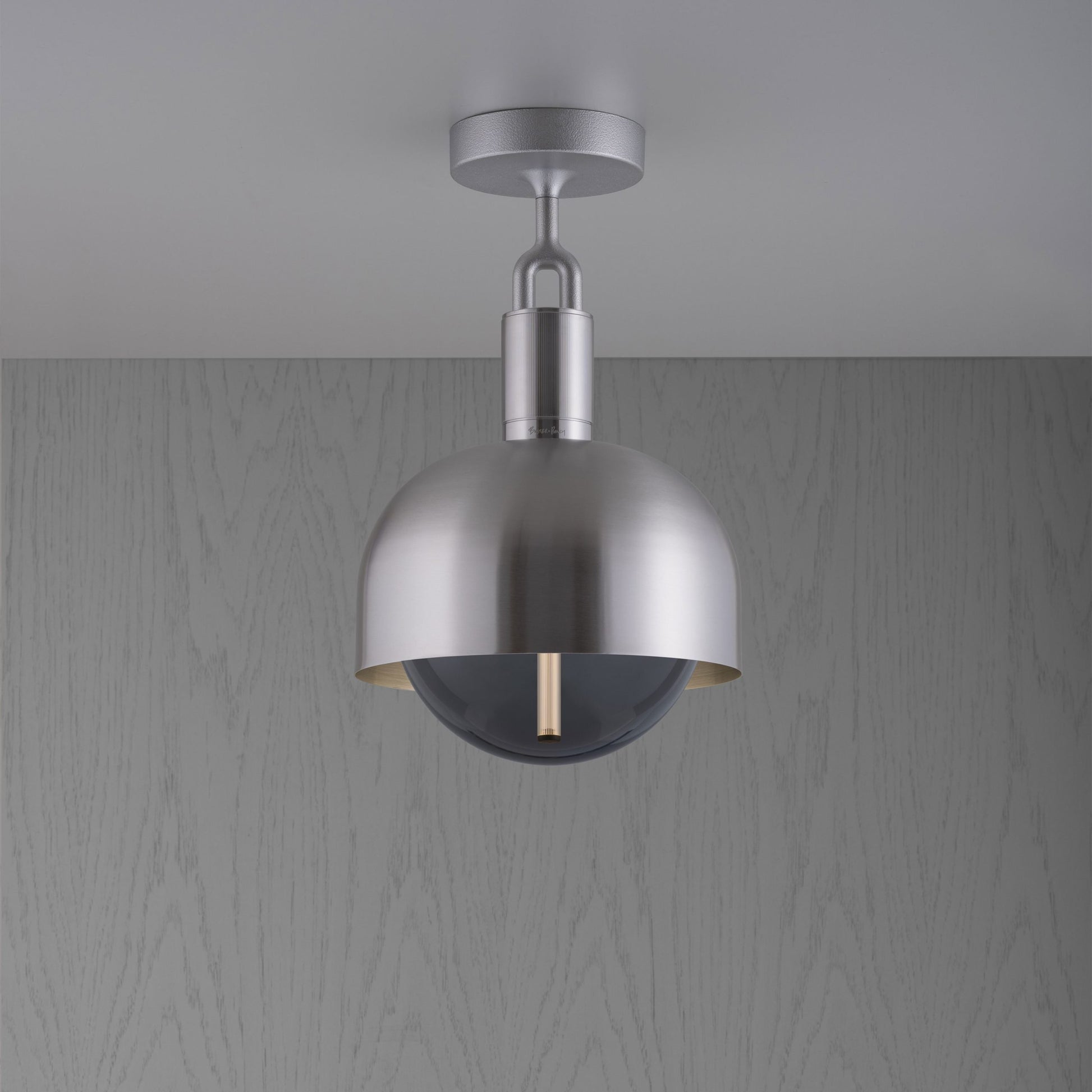 Eine Deckenleuchte und ein Schirm. Kombination maschinell bearbeitet. handgesponnenes und gegossenes massives Metall. alles von Hand verfeinert. Es verfügt über unsere gegossenen Gabeldetails und die charakteristische lineare Rändelung im Diamantschliff. Die Leuchte wird komplett mit einer mundgeblasenen Opalglaskugel und einer Forked-spezifischen dimmbaren Buster-Glühbirne geliefert. In dieser Konfiguration entsteht ein funktionales Umgebungslicht.