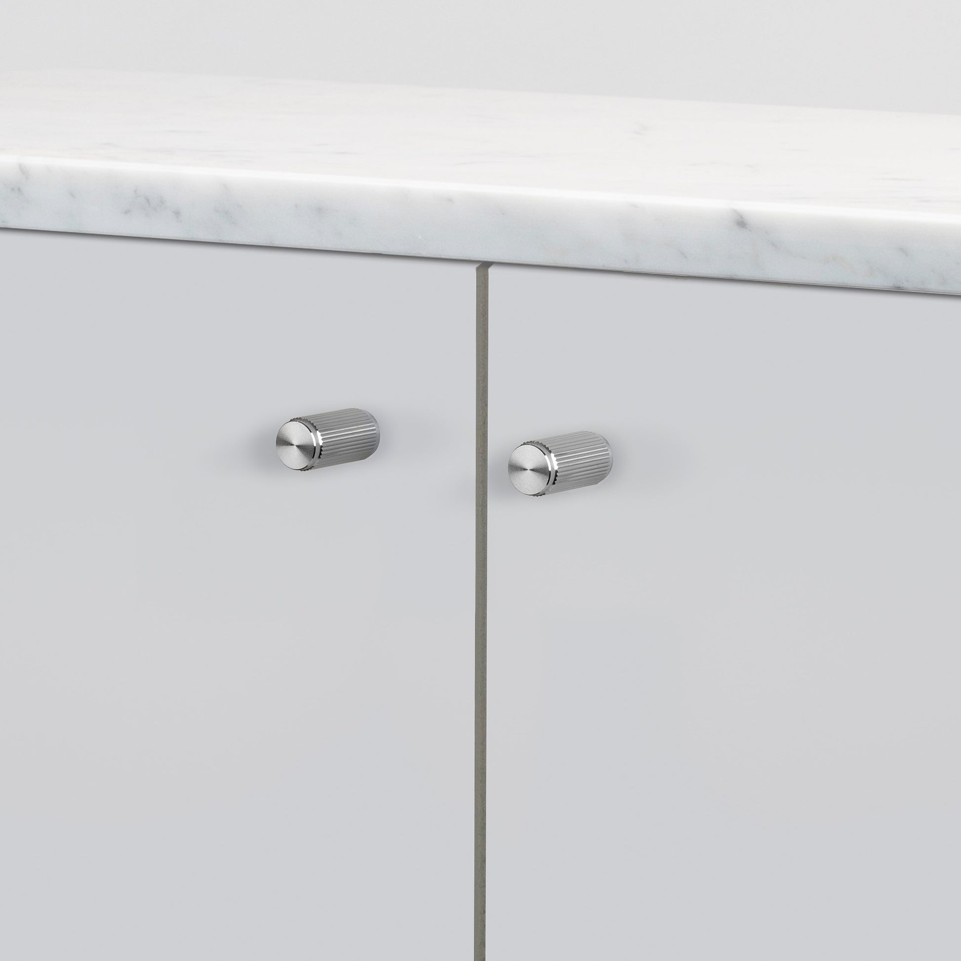 Ein Paar Möbelknöpfe aus massivem Edelstahl. Diese Knöpfe weisen unser charakteristisches, diamantgeschliffenes, lineares Rändelmuster auf und werden von Hand verfeinert.