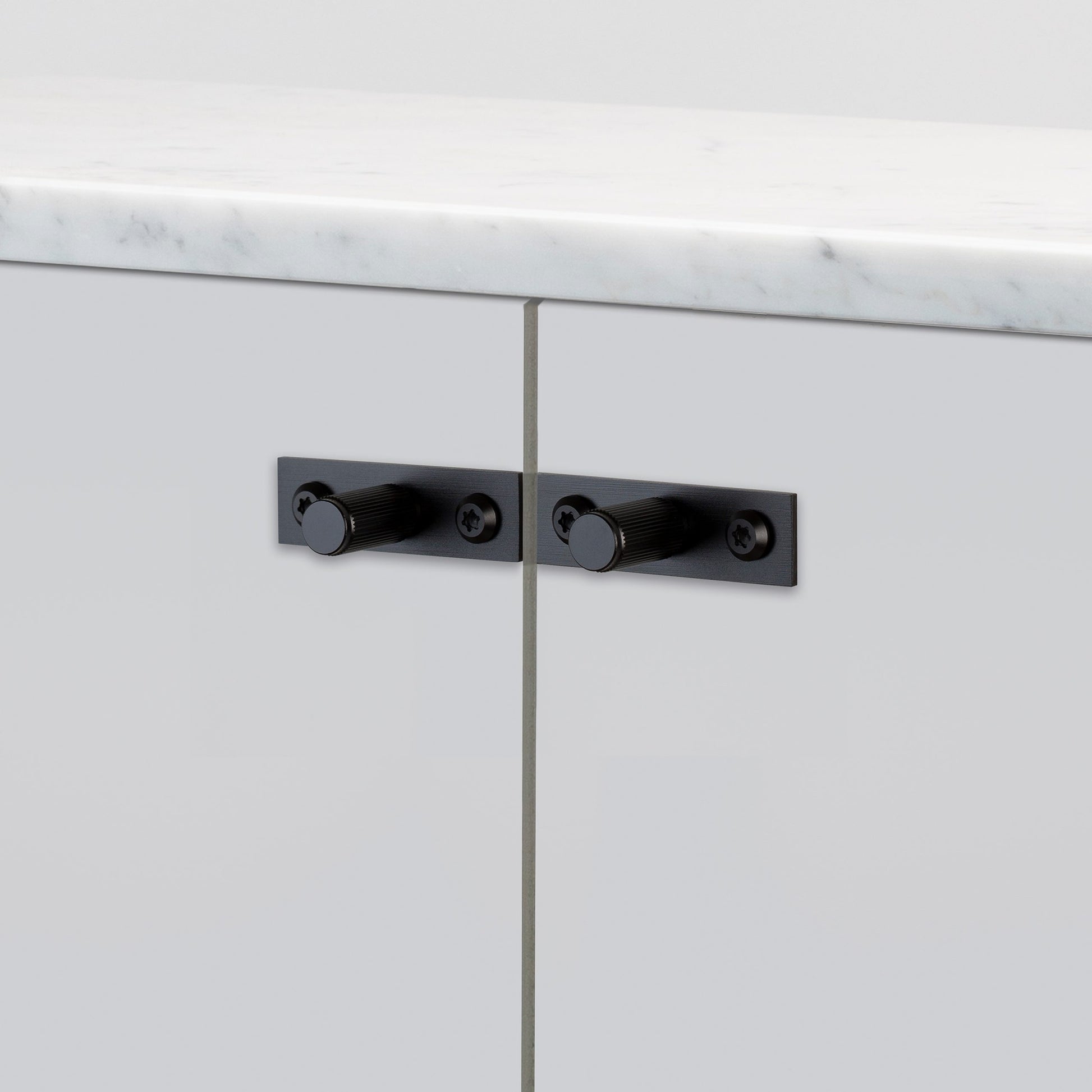 Ein Paar Möbelknöpfe aus schwarz eloxiertem Metall. Diese Knöpfe weisen unser charakteristisches, diamantgeschliffenes, lineares Rändelmuster auf und werden von Hand verfeinert. Sie werden komplett mit schwarzen Metallrückplatten geliefert und mit schwarzen Metall-Torx-Schrauben befestigt. Sie eignen sich hervorragend für Schranktüren, Schränke, Kücheneinheiten und praktisch alles, was sich öffnen lässt. Verkauft im Zweier-Set.