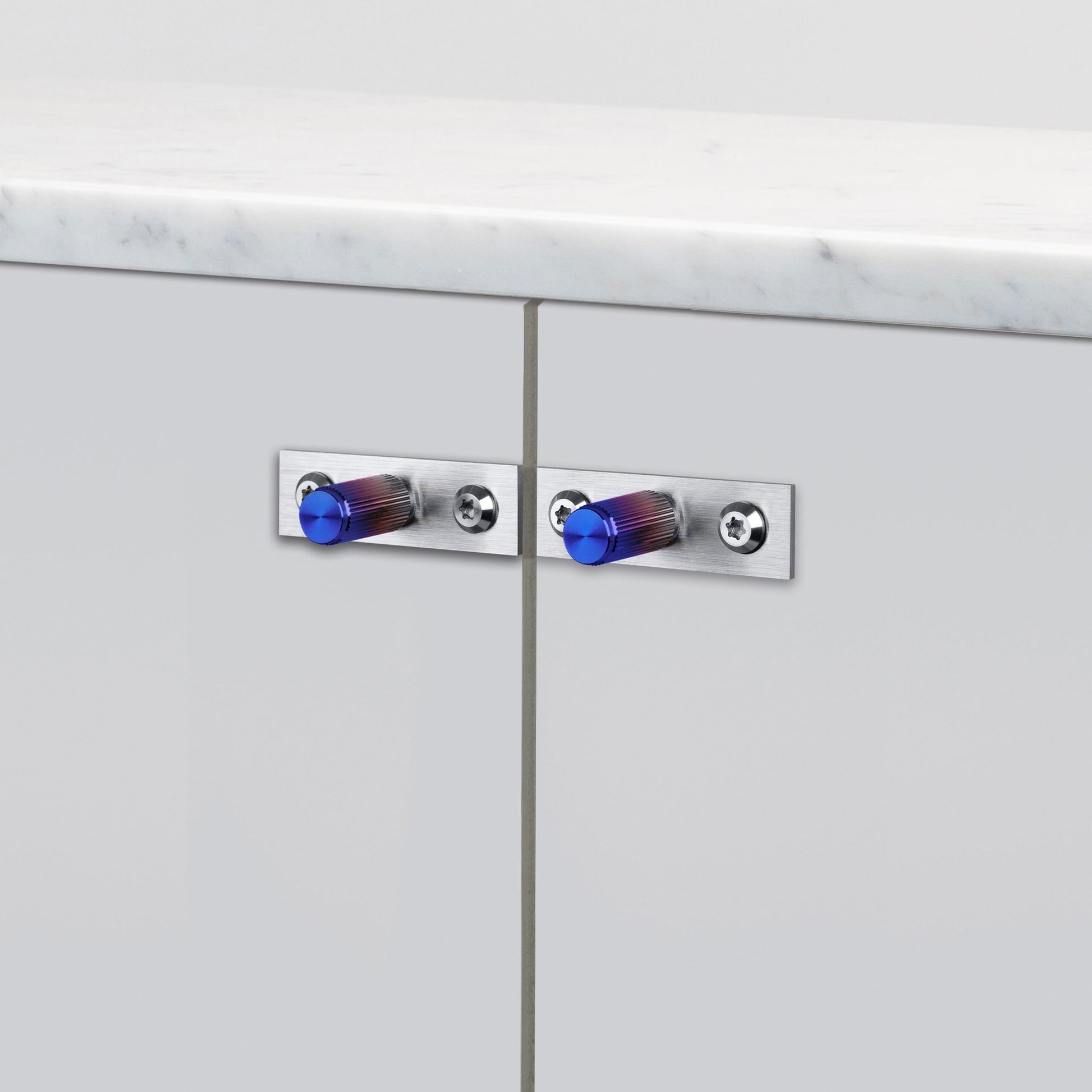 Ein Paar Möbelknöpfe aus massivem Edelstahl, die übermäßiger Hitze ausgesetzt wurden, um unser einzigartiges Finish aus gebranntem Stahl zu erzielen. Ein Regenbogen aus Blau, Lila und Gelb sorgt dafür, dass kein Finish dem anderen gleicht.