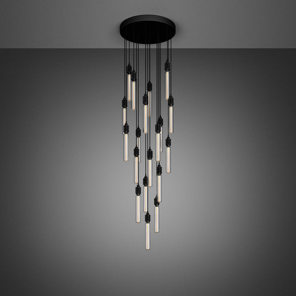 Ein maßgeschneiderter CASCADE-Kronleuchter mit 19 oder 31 Leuchtenanhängern aus massivem Metall und unserem Kreuzrändelmuster. Dieser Kronleuchter verfügt über HEAVY METAL-Leuchten und wird von freiliegenden LED-BUSTER-Glühbirnen angetrieben, um ein warmes und stimmungsvolles Licht zu erzeugen. Maßgeschneidert, um perfekt in Ihren Raum zu passen.