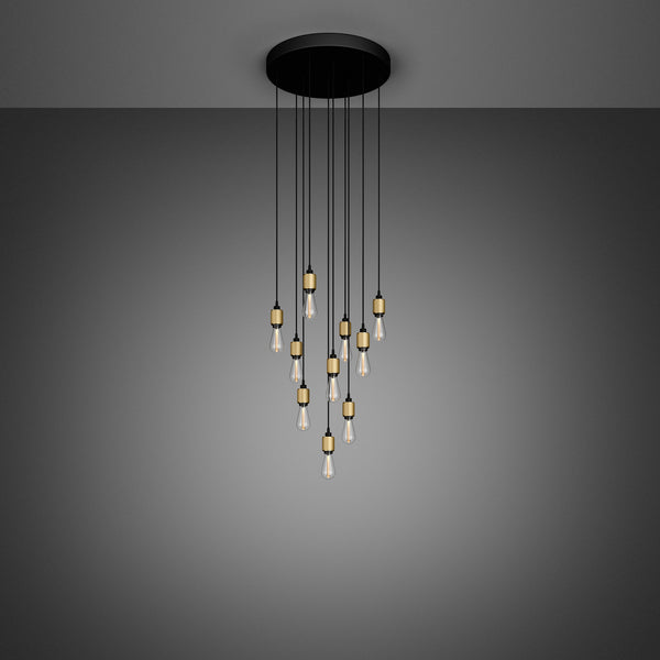 Ein maßgeschneiderter CASCADE-Kronleuchter mit 19 oder 31 Leuchtenanhängern aus massivem Metall und unserem Kreuzrändelmuster. Dieser Kronleuchter verfügt über HEAVY METAL-Leuchten und wird von freiliegenden LED-BUSTER-Glühbirnen angetrieben, um ein warmes und stimmungsvolles Licht zu erzeugen. Maßgeschneidert, um perfekt in Ihren Raum zu passen.