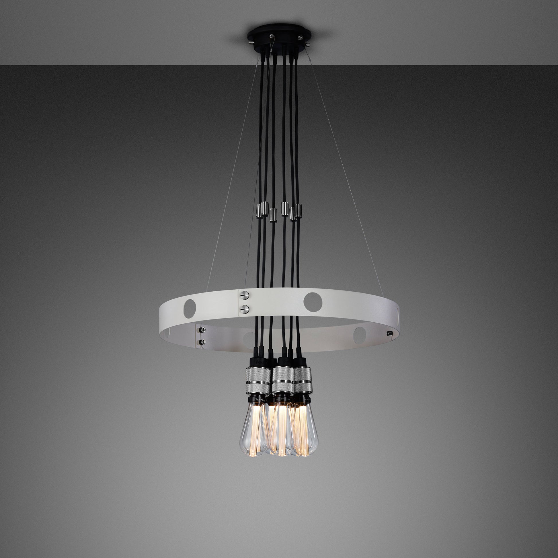 Ein Kronleuchter aus 3 mm starkem Stahl mit Steinpulverbeschichtung und sechs Anhängern. mit massivem, gerändeltem Metall und matten Gummidetails.