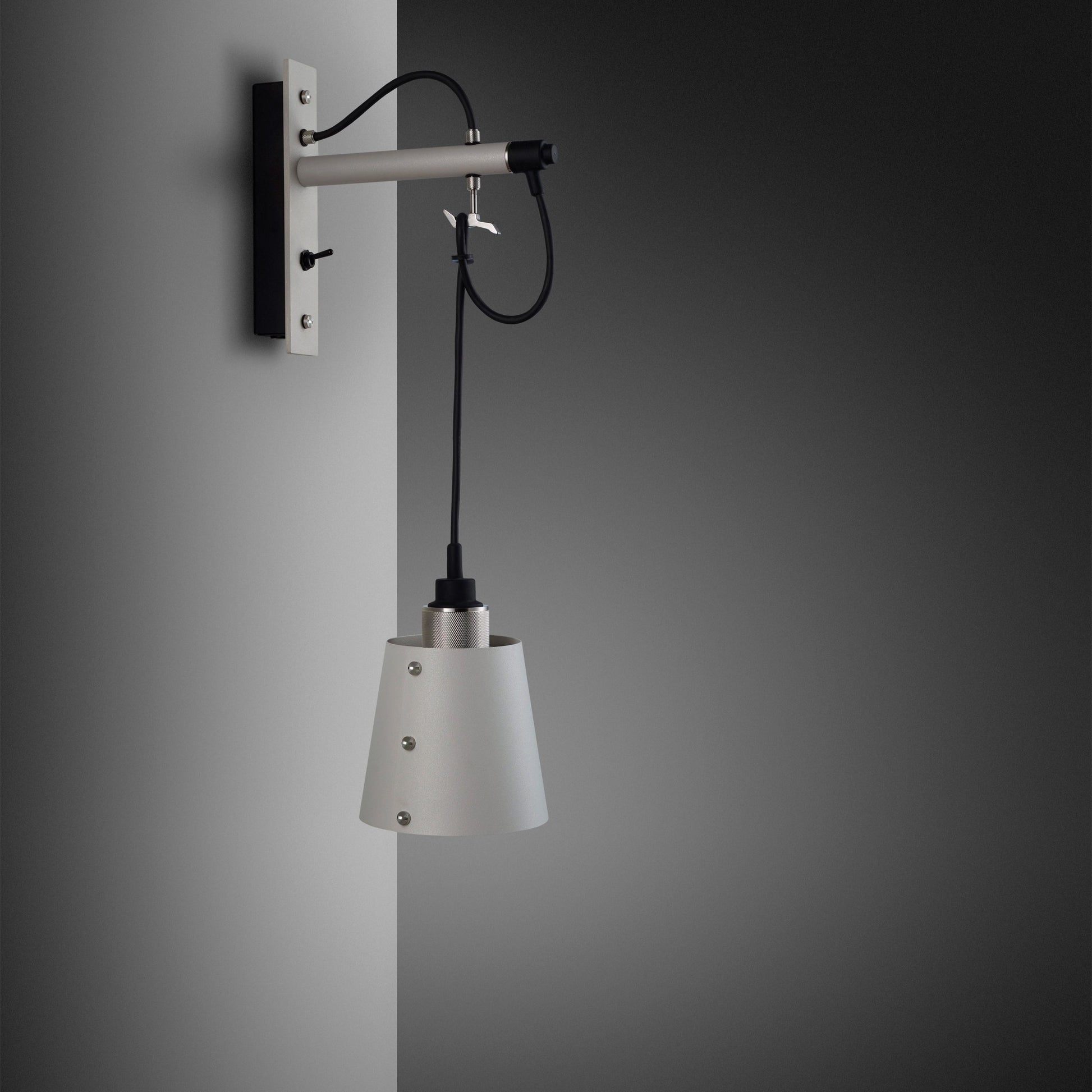 Eine Wandleuchte aus steinpulverbeschichtetem Metall mit massiven Stahldetails.