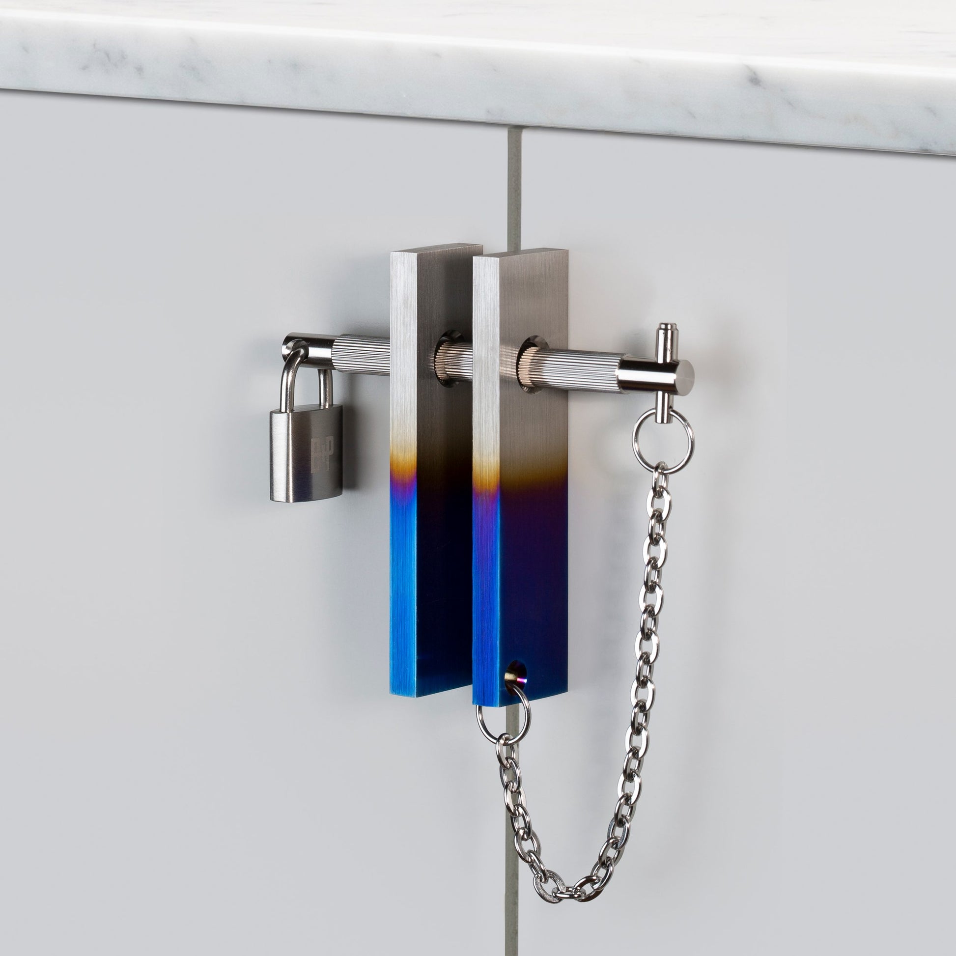 Eine solide horizontale Befestigungsstange aus Edelstahl weist unser charakteristisches lineares Rändelmuster auf und ist mit einer eleganten Modekette aus Stahl befestigt. Die Befestigungsstange kann mit unserem Vorhängeschloss aus massivem Stahl gesichert werden. mit eingraviertem „B+P“-Logo.