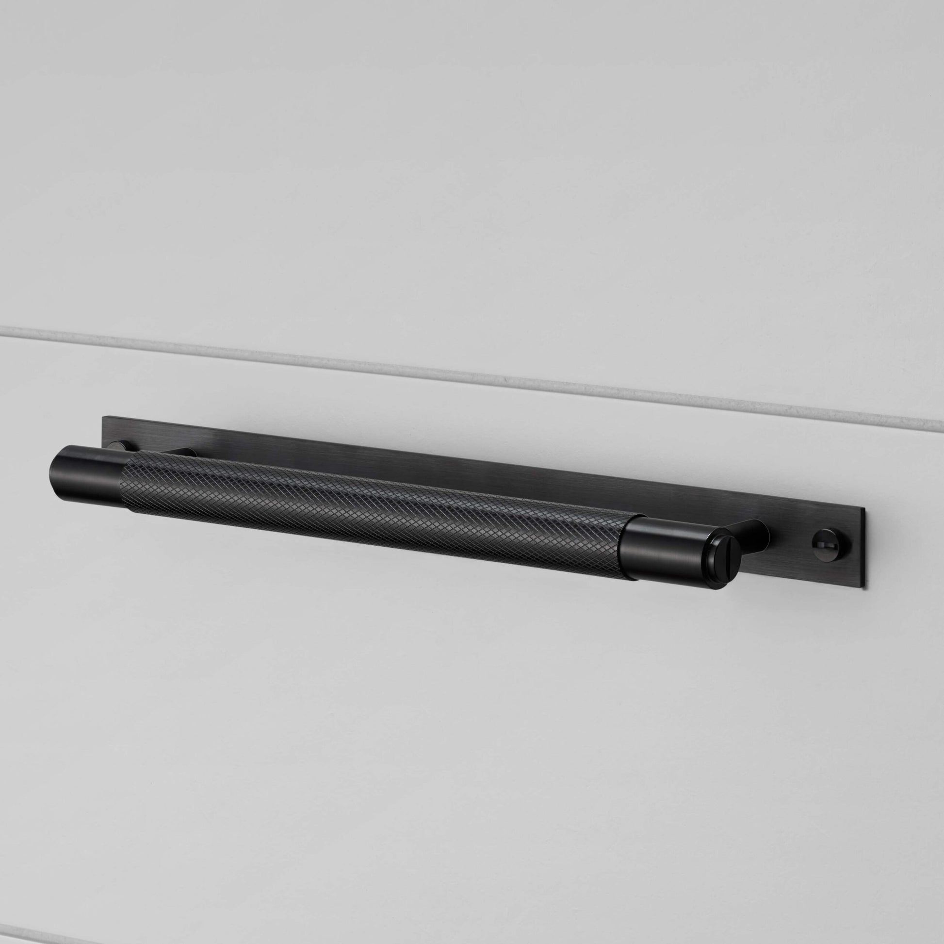 Eine Zugstange aus massivem, schwarz eloxiertem Metall. Diese Zugstange weist unser charakteristisches Diamantschliff-Kreuzrändelmuster auf und wird von Hand verfeinert.