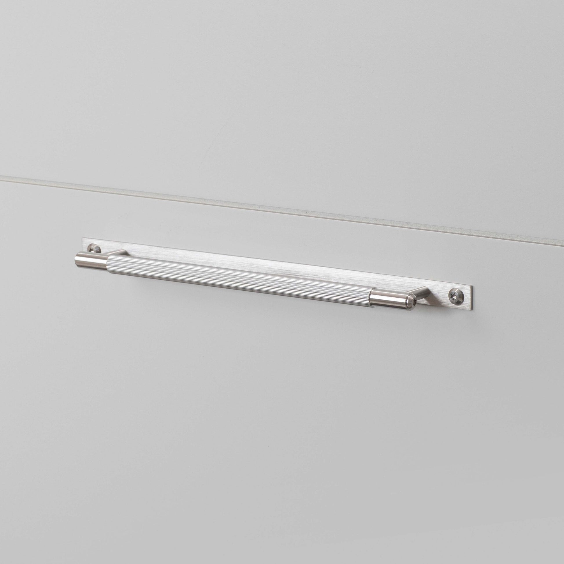 Eine Zugstange aus massivem Edelstahl. Diese Zugstange weist unser charakteristisches, diamantgeschliffenes, lineares Rändelmuster auf und wird von Hand verfeinert. Die Zugstange verfügt über eine rechteckige Rückplatte aus massivem Edelstahl, die mit Torx-Schrauben aus Edelstahl versehen ist.