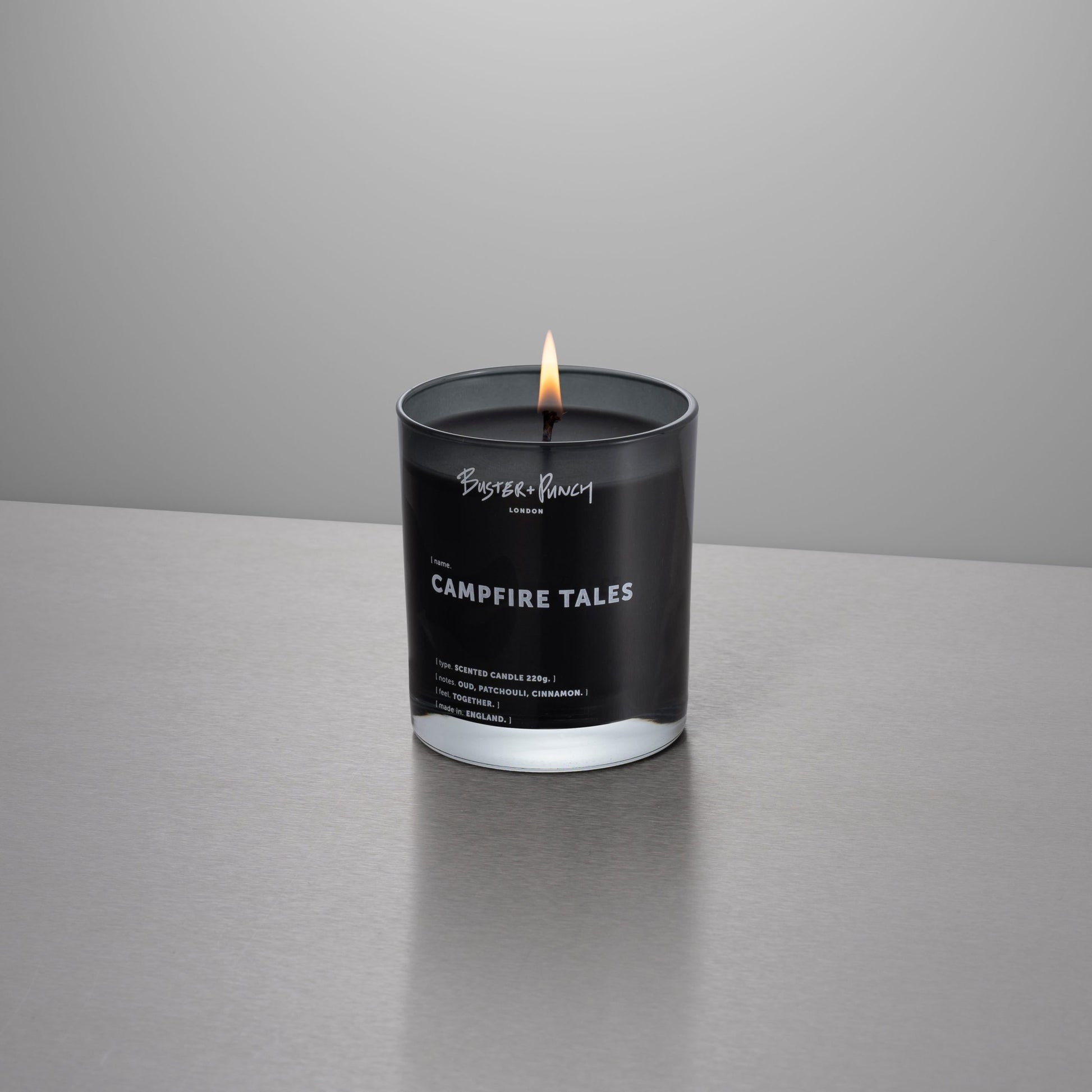 Eine 220 g schwere Luxus-Duftkerze, hergestellt aus schwarzem Wachs mit unserem maßgeschneiderten handgefertigten Duft, in einem wiederverwendbaren rauchgrauen Glas. Noten von Oud, Patschuli und Zimt wärmen sanft.