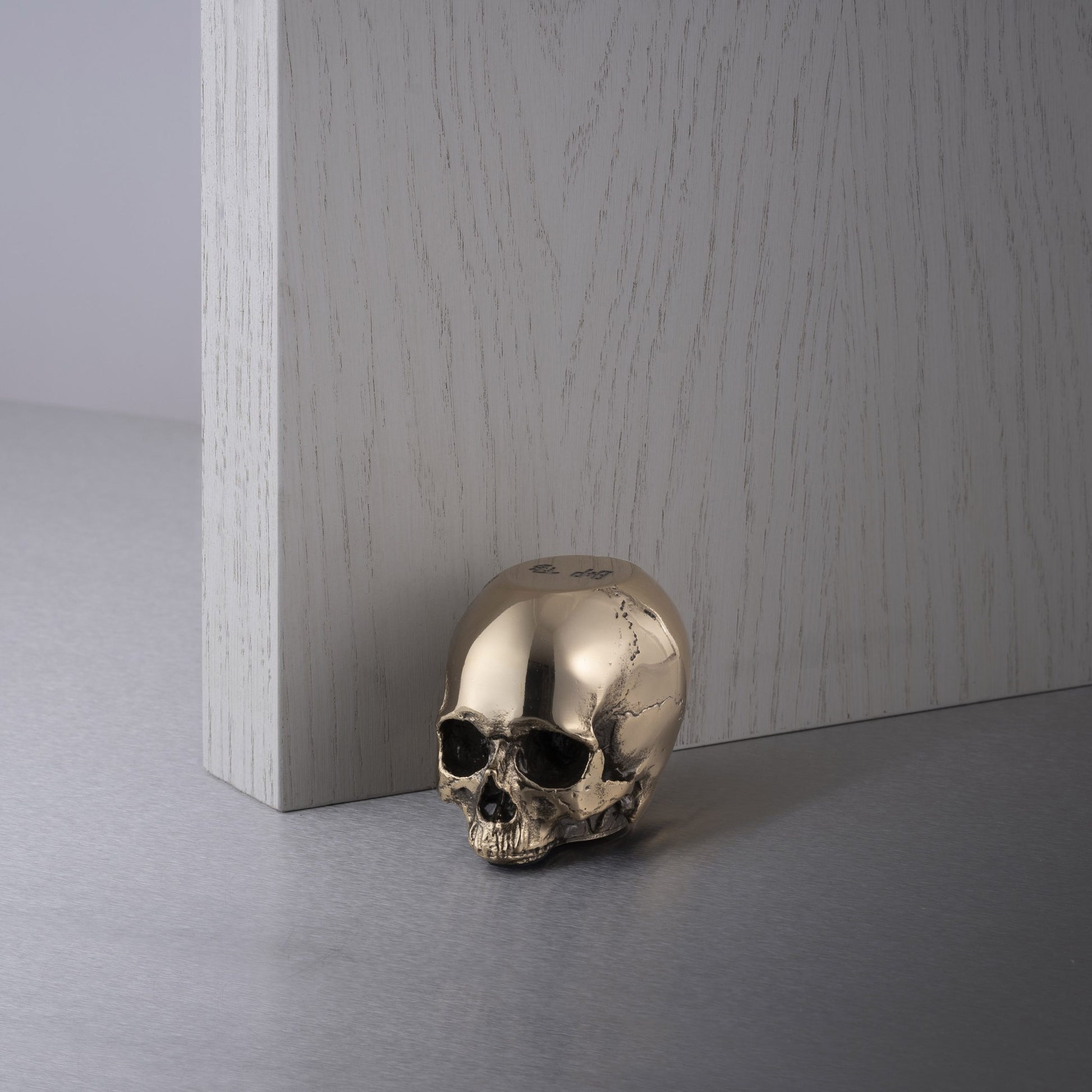 Ein freistehender Totenkopf-Türstopper aus Messing aus geschmolzenem Gussmetall, von Hand poliert und veredelt. Ein Gummipuffer an der Unterseite hält ihn stabil und verhindert Kratzer auf Ihrem Boden.