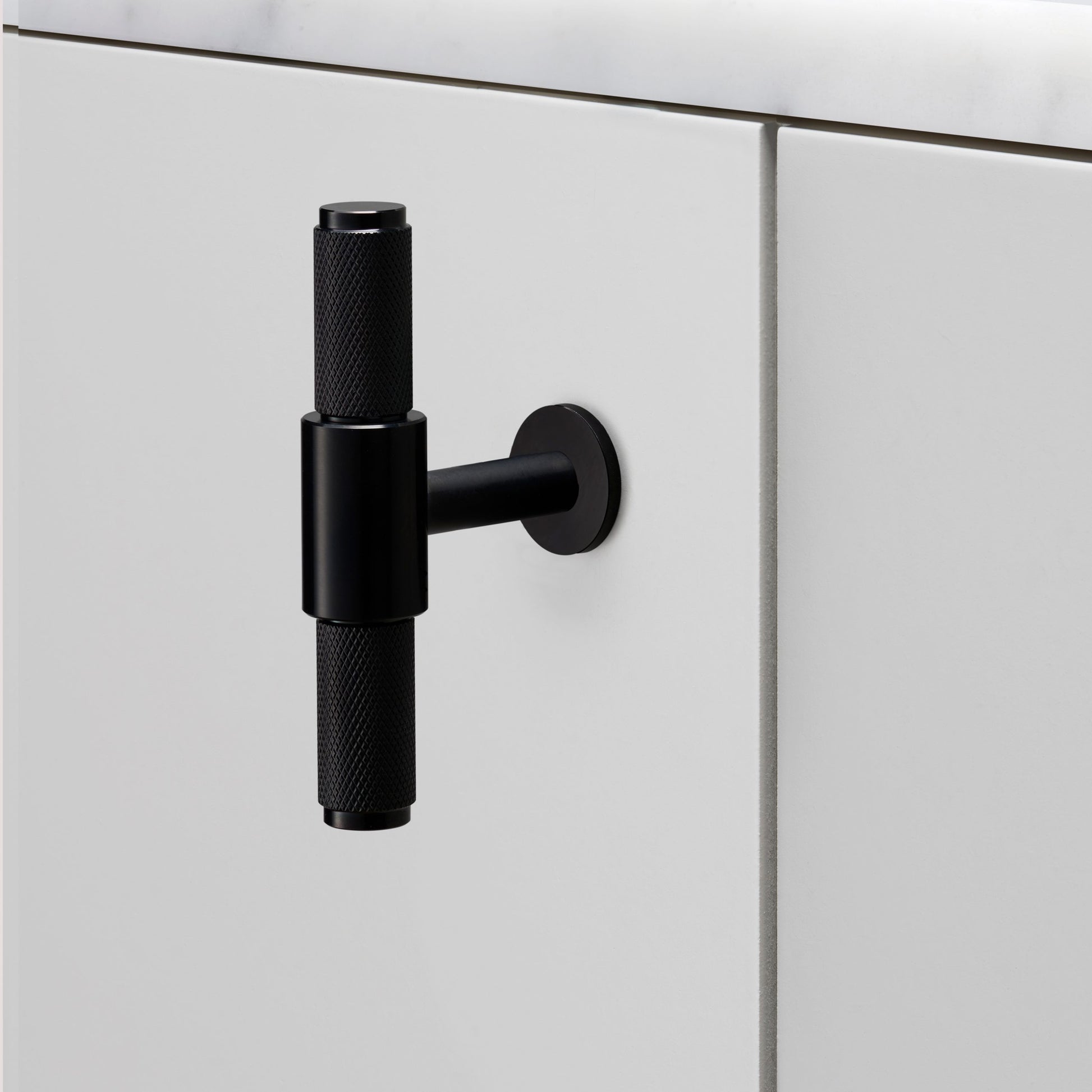 Eine T-Stange aus massivem, schwarz eloxiertem Metall. Diese T-Bar trägt unsere Signatur. Diamant Schnitt. Kreuzrändelmuster und wird von Hand veredelt.