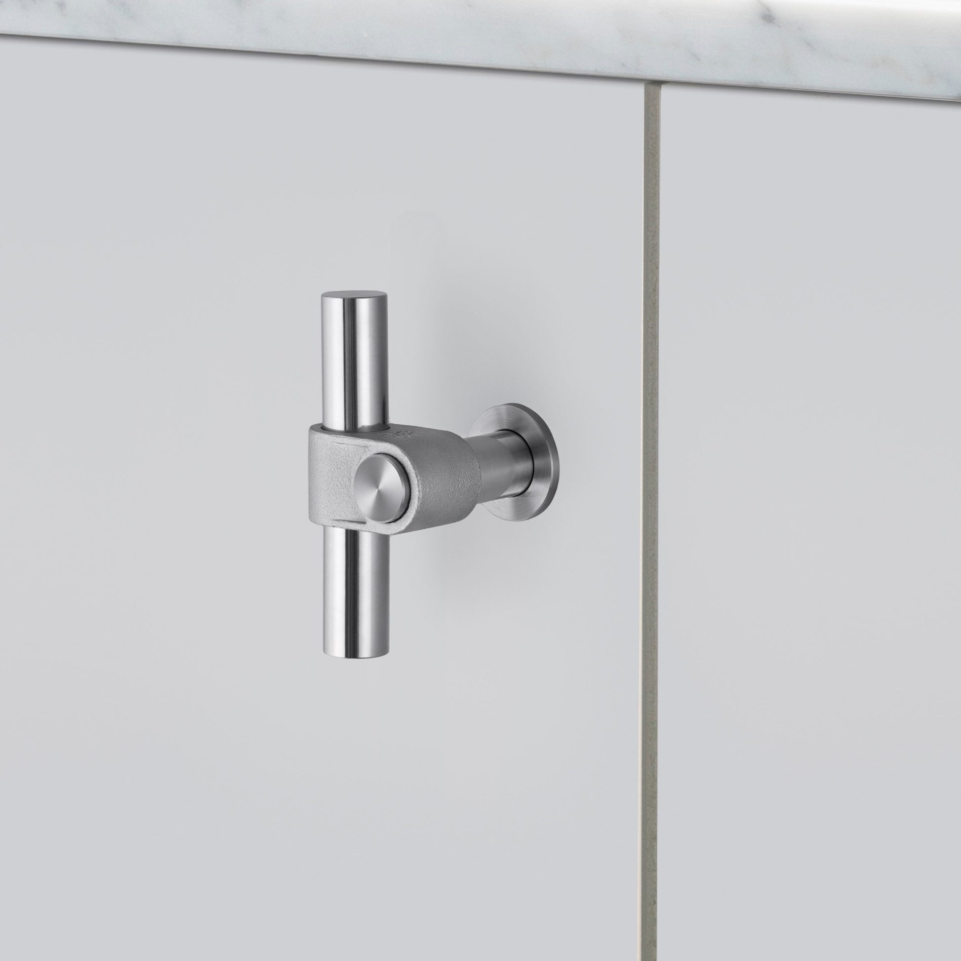 Eine T-Bar aus massivem Edelstahl gefertigt und von Hand veredelt. Diese T-Bar verfügt über unseren charakteristischen Knöchel aus grobem Guss. handpolierter massiver Metallstab und ein geprägtes B+P-Emblem auf dem Knöchel.